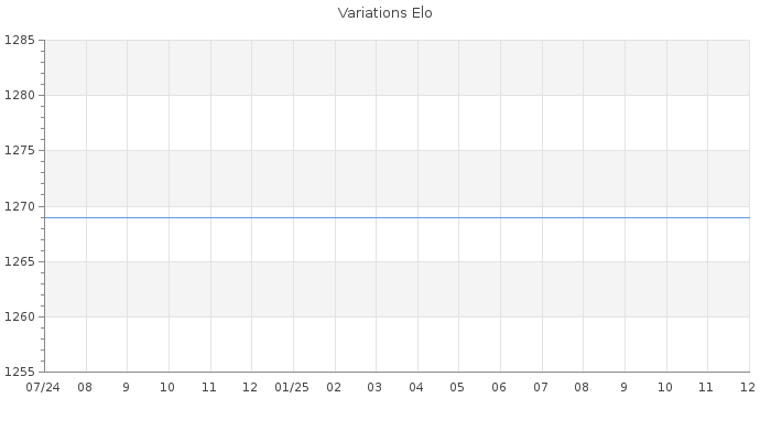 Date d'inscription : 06/07/24. Donateur pour EchecsEmail : Non ( Cliquez ici pour soutenir EchecsEmail. ) Elo non arrondi:1240.4 ( 449 sur 454 joueurs ) Nombre de victoires :0 Nombre de nulles :0 Nombre de défaites :1 Rd ( Un petit rd indique un elo fiable ) : 280 Elo maximum atteint ( en étant classé ) :0 Elo maximum atteint cette année :0 Nombre coups joués : 11 Classement coupe : Inactif Points coupe : 0 Classement Coupe Magic Chess : Inactif Points Coupe Magic Chess : 0 Tournoi échelle : Nombre de tournois gagnés :0