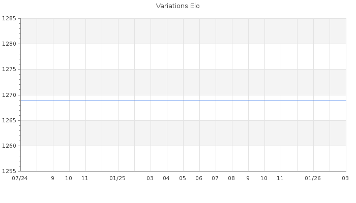 Date d'inscription : 06/07/24. Donateur pour EchecsEmail : Non ( Cliquez ici pour soutenir EchecsEmail. ) Elo non arrondi:1232.4 ( 449 sur 441 joueurs ) Nombre de victoires :0 Nombre de nulles :0 Nombre de défaites :1 Rd ( Un petit rd indique un elo fiable ) : 280 Elo maximum atteint ( en étant classé ) :0 Elo maximum atteint cette année :0 Nombre coups joués : 11 Classement coupe : Inactif Points coupe : 0 Classement Coupe Magic Chess : Inactif Points Coupe Magic Chess : 0 Tournoi échelle : Nombre de tournois gagnés :0