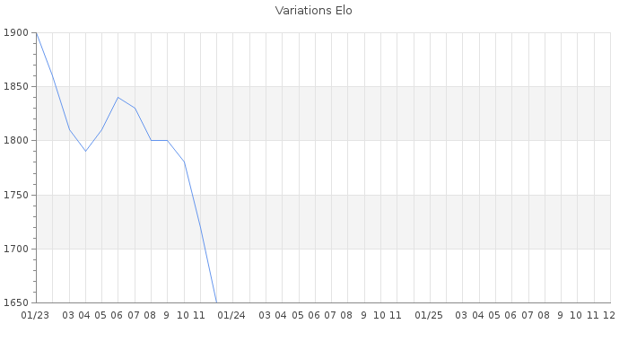 Date d'inscription : 01/10/13. Donateur pour EchecsEmail : Non ( Cliquez ici pour soutenir EchecsEmail. ) Elo non arrondi:1624.7 ( 346 sur 454 joueurs ) Nombre de victoires :454 Nombre de nulles :92 Nombre de défaites :520 Temps de réponse moyen par coup : 0J 17H 47M 30S ( Moyenne sur 0 coups ). Rd ( Un petit rd indique un elo fiable ) : 69 Magic Elo:1600 Magic Rd : 350 Elo maximum atteint ( en étant classé ) :1950 Elo maximum atteint cette année :0 Nombre coups joués : 46610 Classement coupe : Inactif Points coupe : 0 Classement Coupe Magic Chess : Inactif Points Coupe Magic Chess : 0 Tournoi échelle : Nombre de tournois gagnés :0