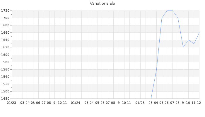 Date d'inscription : 03/10/15. Donateur pour EchecsEmail : Non ( Cliquez ici pour soutenir EchecsEmail. ) Elo non arrondi:1662.5 ( 303 sur 454 joueurs ) Nombre de victoires :1001 Nombre de nulles :86 Nombre de défaites :1098 Temps de réponse moyen par coup : 0J 3H 25M 46S ( Moyenne sur 1534 coups ). Rd ( Un petit rd indique un elo fiable ) : 53 Magic Elo:1584.05 Magic Rd : 242 Elo maximum atteint ( en étant classé ) :1800 Elo maximum atteint cette année :1740 Nombre coups joués : 85199 Classement coupe : Inactif Points coupe : 0.14 Classement Coupe Magic Chess : Inactif Points Coupe Magic Chess : 0 Tournoi échelle : Inactif. Tournois gagnés : 29/11/2025 : Cat 2 : Victoire dans le tournoi n°27261 31/10/2025 : Cat 2 : Victoire dans le tournoi n°27157 03/08/2025 : Cat 2 : Victoire dans le tournoi n°26918 17/05/2025 : Cat 2 : Victoire dans le tournoi n°26732 29/04/2025 : Cat 1 : Victoire dans le tournoi n°26669 02/05/2021 : Cat 2 : Victoire dans le tournoi n°22669 17/04/2021 : Cat 2 : Victoire dans le tournoi n°22588 11/02/2021 : Cat 2 : Victoire dans le tournoi n°22375 08/01/2021 : Cat 2 : Victoire dans le tournoi n°22173 15/11/2020 : Cat 2 : Victoire dans le tournoi n°21954 28/10/2020 : Cat 2 : Victoire dans le tournoi n°21884 14/10/2020 : Cat 2 : Victoire dans le tournoi n°21860 01/10/2020 : Cat 2 : Victoire dans le tournoi n°21805 31/08/2020 : Cat 2 : Victoire dans le tournoi n°21661 07/04/2020 : Cat 3 : Victoire dans le tournoi n°21004 16/01/2020 : Cat 3 : Victoire dans le tournoi n°20560 11/01/2020 : Cat 3 : Victoire dans le tournoi n°20354 29/12/2019 : Cat 2 : Victoire dans le tournoi n°20557 14/12/2019 : Cat 2 : Victoire dans le tournoi n°20449 28/11/2019 : Cat 2 : Victoire dans le tournoi n°20346 09/10/2019 : Cat 2 : Victoire dans le tournoi n°20159 01/10/2019 : Cat 3 : Victoire dans le tournoi n°20141 24/09/2019 : Cat 2 : Victoire dans le tournoi n°20123 06/09/2019 : Cat 2 : Victoire dans le tournoi n°19997 01/09/2019 : Cat 2 : Victoire dans le tournoi n°19957 13/08/2019 : Cat 3 : Victoire dans le tournoi n°19981 13/04/2019 : Cat 3 : Victoire dans le tournoi n°19546 27/03/2019 : Cat 3 : Victoire dans le tournoi n°19449 22/03/2019 : Cat 3 : Victoire dans le tournoi n°19436 23/01/2019 : Cat 2 : Victoire dans le tournoi n°19153 24/12/2018 : Cat 2 : Victoire dans le tournoi n°19080 06/12/2018 : Cat 2 : Victoire dans le tournoi n°18858 10/11/2018 : Cat 2 : Victoire dans le tournoi n°18810 08/11/2018 : Cat 2 : Victoire dans le tournoi n°18904 18/09/2018 : Cat 3 : Victoire dans le tournoi n°18628 16/08/2018 : Cat 2 : Victoire dans le tournoi n°18500 06/08/2018 : Cat 2 : Victoire dans le tournoi n°18467 01/08/2018 : Cat 2 : Victoire dans le tournoi n°18431 25/12/2017 : Cat 2 : Victoire dans le tournoi n°17465 14/11/2017 : Cat 2 : Victoire dans le tournoi n°17289 25/10/2017 : Cat 2 : Victoire dans le tournoi n°17081 06/09/2017 : Cat 2 : Victoire dans le tournoi n°17004 26/03/2017 : Cat 2 : Victoire dans le tournoi n°16272 21/12/2015 : Cat 1 : Victoire dans le tournoi n°18609 Nombre de tournois gagnés :44