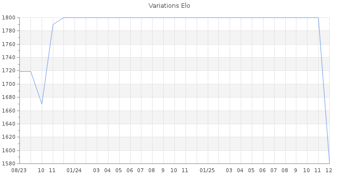 Date d'inscription : 15/08/23. Donateur pour EchecsEmail : Non ( Cliquez ici pour soutenir EchecsEmail. ) Elo non arrondi:1575 ( 339 sur 452 joueurs ) Nombre de victoires :7 Nombre de nulles :0 Nombre de défaites :7 Temps de réponse moyen par coup : 0J 19H 53M 29S ( Moyenne sur 46 coups ). Rd ( Un petit rd indique un elo fiable ) : 135 Elo maximum atteint ( en étant classé ) :1800 Elo maximum atteint cette année :1600 Nombre coups joués : 401 Classement coupe : Inactif Points coupe : 0 Classement Coupe Magic Chess : Inactif Points Coupe Magic Chess : 0 Tournoi échelle : Tournois gagnés : 22/11/2023 : Cat 2 : Victoire dans le tournoi n°25317 Nombre de tournois gagnés :1