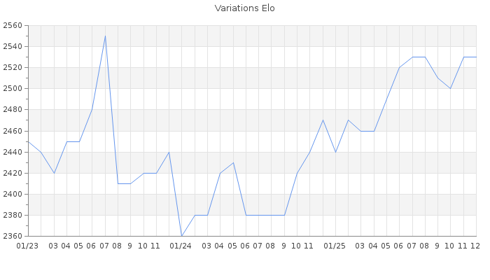 Date d'inscription : 24/07/17. Donateur pour EchecsEmail : Non ( Cliquez ici pour soutenir EchecsEmail. ) Elo non arrondi:2531 ( 22 sur 449 joueurs ) Nombre de victoires :834 Nombre de nulles :235 Nombre de défaites :220 Temps de réponse moyen par coup : 0J 11H 19M 50S ( Moyenne sur 630 coups ). Rd ( Un petit rd indique un elo fiable ) : 74 Magic Elo:1865.59 Magic Rd : 125 Elo maximum atteint ( en étant classé ) :2550 Elo maximum atteint cette année :2550 Nombre coups joués : 37628 Inscrit dans l' équipe:Mission Impossible Classement coupe : 44 Points coupe : 802 Classement Coupe Magic Chess : Inactif Points Coupe Magic Chess : 0 Tournoi échelle : Inactif. Tournois gagnés : 13/07/2025 : Cat 6 : Victoire dans le tournoi n°26747 30/11/2024 : Cat 5 : Premier au tournoi multi Automne 2024 n°1 11/10/2024 : Cat 4 : Premier au tournoi multi Automne 2024 n°3 05/08/2022 : Cat 5 : Victoire dans le tournoi n°23792 14/10/2019 : Cat 4 : Premier au tournoi multi Automne 2019 n°4 30/08/2019 : Cat 4 : Victoire CC Juil19 15/02/2019 : Cat 4 : Premier au tournoi multi Noël 2018 n°4 08/12/2018 : Cat 6 : Victoire dans le tournoi n°18881 28/11/2018 : Cat 4 : Premier au tournoi multi Halloween 2018 n°4 16/02/2018 : Cat 0 : Premier au tournoi multi Noël 2017 n°6 26/10/2017 : Cat 0 : Premier au tournoi multi Automne 2017 n°6 29/09/2017 : Cat 5 : Victoire dans le tournoi n°17016 17/09/2017 : Cat 4 : Victoire dans le tournoi n°16919 12/09/2017 : Cat 4 : Victoire dans le tournoi n°16914 01/09/2017 : Cat 1 : Victoire dans le tournoi n°16891 22/08/2017 : Cat 2 : Victoire dans le tournoi n°16893 Nombre de tournois gagnés :20