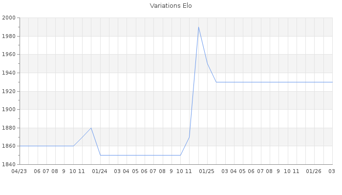 Date d'inscription : 30/07/18. Donateur pour EchecsEmail : Non ( Cliquez ici pour soutenir EchecsEmail. ) Elo non arrondi:1897.8 ( 192 sur 441 joueurs ) Nombre de victoires :170 Nombre de nulles :7 Nombre de défaites :121 Temps de réponse moyen par coup : 0J 8H 58M 31S ( Moyenne sur 0 coups ). Rd ( Un petit rd indique un elo fiable ) : 105 Magic Elo:1600 Magic Rd : 350 Elo maximum atteint ( en étant classé ) :2000 Elo maximum atteint cette année :0 Nombre coups joués : 10223 Classement coupe : Inactif Points coupe : 0 Classement Coupe Magic Chess : Inactif Points Coupe Magic Chess : 0 Tournoi échelle : Inactif. Nombre de tournois gagnés :0