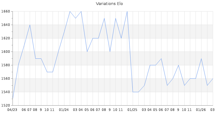 Date d'inscription : 13/10/14. Donateur pour EchecsEmail : Non ( Cliquez ici pour soutenir EchecsEmail. ) Elo non arrondi:1564.8 ( 329 sur 442 joueurs ) Nombre de victoires :1532 Nombre de nulles :253 Nombre de défaites :1352 Temps de réponse moyen par coup : 0J 5H 47M 33S ( Moyenne sur 4039 coups ). Rd ( Un petit rd indique un elo fiable ) : 51 Magic Elo:1600 Magic Rd : 350 Elo maximum atteint ( en étant classé ) :1880 Elo maximum atteint cette année :1590 Nombre coups joués : 145324 Classement coupe : Inactif Points coupe : 0 Classement Coupe Magic Chess : Inactif Points Coupe Magic Chess : 0 Tournoi échelle : Inactif. Tournois gagnés : 26/02/2026 : Cat 2 : Victoire dans le tournoi n°27467 07/01/2026 : Cat 2 : Victoire dans le tournoi n°27140 31/12/2025 : Cat 2 : Victoire dans le tournoi n°27254 22/12/2025 : Cat 2 : Victoire dans le tournoi n°27243 19/12/2025 : Cat 2 : Victoire dans le tournoi n°27290 14/12/2025 : Cat 2 : Victoire dans le tournoi n°27185 06/12/2025 : Cat 2 : Victoire dans le tournoi n°27255 05/12/2025 : Cat 2 : Victoire dans le tournoi n°26973 17/10/2025 : Cat 2 : Victoire dans le tournoi n°26916 24/09/2025 : Cat 2 : Victoire dans le tournoi n°27009 29/07/2025 : Cat 2 : Victoire dans le tournoi n°26886 15/05/2025 : Cat 2 : Victoire dans le tournoi n°26644 19/04/2025 : Cat 2 : Victoire dans le tournoi n°26628 10/04/2025 : Cat 2 : Victoire dans le tournoi n°26528 14/02/2025 : Cat 2 : Victoire dans le tournoi n°26462 04/02/2025 : Cat 2 : Victoire dans le tournoi n°26337 27/12/2024 : Cat 2 : Victoire dans le tournoi n°26285 16/12/2024 : Cat 2 : Victoire dans le tournoi n°26259 13/12/2024 : Cat 2 : Victoire dans le tournoi n°26268 25/11/2024 : Cat 2 : Victoire dans le tournoi n°26193 09/11/2024 : Cat 2 : Victoire dans le tournoi n°26203 06/11/2024 : Cat 2 : Victoire dans le tournoi n°26170 12/10/2024 : Cat 2 : Victoire dans le tournoi n°26102 23/08/2024 : Cat 2 : Victoire dans le tournoi n°26008 25/04/2024 : Cat 2 : Victoire dans le tournoi n°25696 29/02/2024 : Cat 2 : Victoire dans le tournoi n°25524 20/02/2024 : Cat 2 : Victoire dans le tournoi n°25435 18/02/2024 : Cat 2 : Victoire dans le tournoi n°25473 09/01/2024 : Cat 2 : Victoire dans le tournoi n°25472 20/06/2023 : Cat 2 : Victoire dans le tournoi n°24874 16/06/2023 : Cat 2 : Victoire dans le tournoi n°24915 23/05/2023 : Cat 2 : Victoire dans le tournoi n°24854 06/03/2023 : Cat 2 : Victoire dans le tournoi n°24663 23/02/2023 : Cat 2 : Victoire dans le tournoi n°24617 15/01/2023 : Cat 2 : Victoire dans le tournoi n°24561 31/12/2022 : Cat 2 : Victoire dans le tournoi n°24466 26/12/2022 : Cat 2 : Victoire dans le tournoi n°24441 12/12/2022 : Cat 2 : Victoire dans le tournoi n°24433 07/12/2022 : Cat 2 : Victoire dans le tournoi n°24449 23/11/2022 : Cat 2 : Victoire dans le tournoi n°24416 21/11/2022 : Cat 2 : Victoire dans le tournoi n°24382 14/11/2022 : Cat 2 : Victoire dans le tournoi n°24366 15/10/2022 : Cat 2 : Victoire dans le tournoi n°24206 10/10/2022 : Cat 2 : Victoire dans le tournoi n°24200 29/09/2022 : Cat 2 : Victoire dans le tournoi n°24265 24/09/2022 : Cat 2 : Victoire dans le tournoi n°24236 15/09/2022 : Cat 2 : Victoire dans le tournoi n°24069 04/09/2022 : Cat 2 : Victoire dans le tournoi n°24187 02/09/2022 : Cat 2 : Victoire dans le tournoi n°24156 26/08/2022 : Cat 2 : Victoire dans le tournoi n°24175 10/08/2022 : Cat 2 : Victoire dans le tournoi n°24160 28/04/2022 : Cat 2 : Victoire dans le tournoi n°23744 22/01/2022 : Cat 2 : Victoire dans le tournoi n°23440 24/12/2021 : Cat 2 : Victoire dans le tournoi n°23455 10/12/2021 : Cat 3 : Victoire dans le tournoi n°23318 12/11/2021 : Cat 3 : Victoire dans le tournoi n°23154 04/11/2021 : Cat 3 : Victoire dans le tournoi n°23251 10/09/2021 : Cat 2 : Victoire dans le tournoi n°23089 03/05/2021 : Cat 2 : Victoire dans le tournoi n°22609 11/04/2021 : Cat 2 : Victoire dans le tournoi n°22514 28/03/2021 : Cat 2 : Victoire dans le tournoi n°22294 19/03/2021 : Cat 2 : Victoire dans le tournoi n°22280 22/02/2021 : Cat 2 : Victoire dans le tournoi n°22202 30/11/2020 : Cat 2 : Victoire dans le tournoi n°22049 27/11/2020 : Cat 2 : Victoire dans le tournoi n°21938 16/11/2020 : Cat 2 : Victoire dans le tournoi n°21964 12/11/2020 : Cat 2 : Victoire dans le tournoi n°21982 17/10/2020 : Cat 2 : Victoire dans le tournoi n°21829 11/10/2020 : Cat 2 : Victoire dans le tournoi n°21762 20/09/2020 : Cat 2 : Victoire dans le tournoi n°21557 18/09/2020 : Cat 2 : Victoire dans le tournoi n°21702 22/08/2020 : Cat 2 : Victoire dans le tournoi n°21642 17/08/2020 : Cat 2 : Victoire dans le tournoi n°21612 16/08/2020 : Cat 2 : Victoire dans le tournoi n°21631 27/06/2020 : Cat 2 : Victoire dans le tournoi n°21362 27/06/2020 : Cat 2 : Victoire dans le tournoi n°21277 28/05/2020 : Cat 2 : Victoire dans le tournoi n°21293 12/05/2020 : Cat 2 : Victoire dans le tournoi n°21165 03/04/2020 : Cat 2 : Victoire dans le tournoi n°20993 24/02/2020 : Cat 2 : Victoire dans le tournoi n°20787 31/12/2019 : Cat 3 : Victoire dans le tournoi n°20341 28/12/2019 : Cat 2 : Victoire dans le tournoi n°20382 05/12/2019 : Cat 3 : Victoire dans le tournoi n°20387 16/11/2019 : Cat 2 : Victoire dans le tournoi n°20216 25/08/2019 : Cat 2 : Victoire dans le tournoi n°19994 17/07/2019 : Cat 2 : Victoire dans le tournoi n°19552 17/07/2019 : Cat 2 : Victoire dans le tournoi n°19676 15/07/2019 : Cat 2 : Victoire dans le tournoi n°19506 07/04/2019 : Cat 2 : Victoire dans le tournoi n°19379 26/02/2019 : Cat 2 : Victoire dans le tournoi n°19251 09/10/2018 : Cat 3 : Victoire dans le tournoi n°18717 08/08/2018 : Cat 2 : Victoire dans le tournoi n°18460 08/08/2018 : Cat 2 : Victoire dans le tournoi n°18435 05/06/2018 : Cat 3 : Victoire dans le tournoi n°17988 15/01/2018 : Cat 2 : Victoire dans le tournoi n°17429 16/09/2017 : Cat 2 : Victoire dans le tournoi n°16960 25/06/2017 : Cat 3 : Victoire dans le tournoi n°16494 14/04/2017