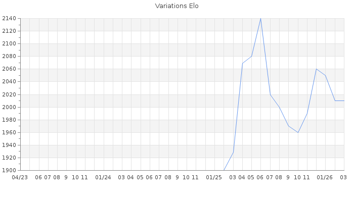 Date d'inscription : 18/04/09. Donateur pour EchecsEmail : Non ( Cliquez ici pour soutenir EchecsEmail. ) Elo non arrondi:2010.3 ( 123 sur 442 joueurs ) Nombre de victoires :186 Nombre de nulles :52 Nombre de défaites :96 Temps de réponse moyen par coup : 1J 7H 10M 14S ( Moyenne sur 75 coups ). Rd ( Un petit rd indique un elo fiable ) : 88 Elo maximum atteint ( en étant classé ) :2230 Elo maximum atteint cette année :2090 Nombre coups joués : 9991 Classement coupe : Inactif Points coupe : 0 Classement Coupe Magic Chess : Inactif Points Coupe Magic Chess : 0 Tournoi échelle : Inactif. Tournois gagnés : 04/12/2025 : Cat 4 : Victoire dans le tournoi n°26943 03/12/2025 : Cat 4 : Victoire dans le tournoi n°27189 05/08/2025 : Cat 4 : Victoire dans le tournoi n°26767 16/06/2025 : Cat 3 : Victoire dans le tournoi n°26623 29/05/2025 : Cat 4 : Victoire dans le tournoi n°26684 25/03/2019 : Cat 4 : Victoire dans le tournoi n°19321 13/10/2018 : Cat 4 : Victoire dans le tournoi n°18124 12/10/2018 : Cat 4 : Victoire dans le tournoi n°17881 15/04/2018 : Cat 4 : Victoire dans le tournoi n°16842 04/03/2018 : Cat 4 : Victoire dans le tournoi n°17292 08/03/2015 : Cat 4 : Victoire dans le tournoi n°16806 19/07/2014 : Cat 5 : Victoire dans le tournoi n°15227 07/03/2014 : Cat 5 : Victoire dans le tournoi n°14273 19/11/2013 : Cat 4 : Victoire dans le tournoi n°13818 24/10/2013 : Cat 4 : Victoire dans le tournoi n°13202 01/09/2013 : Cat 5 : Victoire dans le tournoi n°13038 07/08/2013 : Cat 4 : Victoire dans le tournoi n°12592 06/05/2013 : Cat 4 : Victoire dans le tournoi n°12056 15/07/2012 : Cat 4 : Victoire dans le tournoi n°10428 18/01/2012 : Cat 4 : Victoire dans le tournoi n°9391 04/06/2011 : Cat 3 : Victoire dans le tournoi n°8520 31/05/2011 : Cat 3 : Victoire dans le tournoi n°8630 Nombre de tournois gagnés :22