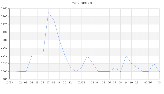 Date d'inscription : 15/12/23. Donateur pour EchecsEmail : Non ( Cliquez ici pour soutenir EchecsEmail. ) Elo non arrondi:1000 ( 439 sur 441 joueurs ) Nombre de victoires :19 Nombre de nulles :0 Nombre de défaites :172 Temps de réponse moyen par coup : 0J 7H 44M 35S ( Moyenne sur 603 coups ). Rd ( Un petit rd indique un elo fiable ) : 79 Elo maximum atteint ( en étant classé ) :1150 Elo maximum atteint cette année :1020 Nombre coups joués : 5960 Classement coupe : Inactif Points coupe : 0 Classement Coupe Magic Chess : Inactif Points Coupe Magic Chess : 0 Tournoi échelle : Nombre de tournois gagnés :0