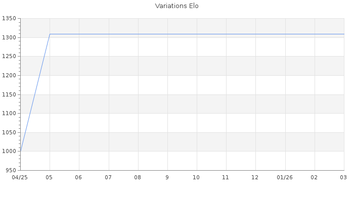Date d'inscription : 15/04/25. Donateur pour EchecsEmail : Non ( Cliquez ici pour soutenir EchecsEmail. ) Elo non arrondi:1276.4 ( 456 sur 441 joueurs ) Nombre de victoires :1 Nombre de nulles :0 Nombre de défaites :4 Temps de réponse moyen par coup : 0J 6H 0M 47S ( Moyenne sur 1 coups ). Rd ( Un petit rd indique un elo fiable ) : 239 Elo maximum atteint ( en étant classé ) :0 Elo maximum atteint cette année :0 Nombre coups joués : 97 Classement coupe : Inactif Points coupe : 0 Classement Coupe Magic Chess : Inactif Points Coupe Magic Chess : 0 Tournoi échelle : Nombre de tournois gagnés :0