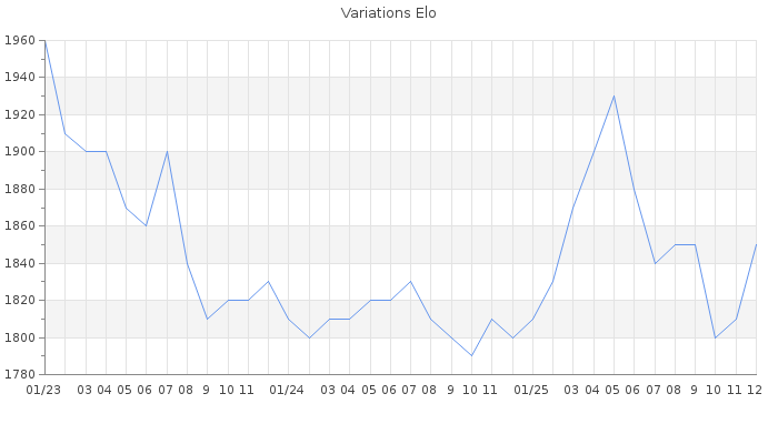 Date d'inscription : Avant le 20/12/05. Donateur pour EchecsEmail : Oui ( Cliquez ici pour soutenir EchecsEmail. ) Elo non arrondi:1850.9 ( 214 sur 462 joueurs ) Nombre de victoires :1499 Nombre de nulles :196 Nombre de défaites :1153 Temps de réponse moyen par coup : 0J 10H 24M 4S ( Moyenne sur 819 coups ). Rd ( Un petit rd indique un elo fiable ) : 59 Magic Elo:1600.07 Magic Rd : 350 Elo maximum atteint ( en étant classé ) :2010 Elo maximum atteint cette année :1940 Nombre coups joués : 108407 Inscrit dans l' équipe:La Diagonale du Fou Classement coupe : Inactif, date de la dernière qualification : 08/01/24 Points coupe : 88.95 Classement Coupe Magic Chess : Inactif Points Coupe Magic Chess : 0 Tournoi échelle : Inactif. Tournois gagnés : 24/05/2024 : Cat 4 : Victoire dans le tournoi n°25505 25/08/2021 : Cat 4 : Victoire dans le tournoi n°22948 28/04/2021 : Cat 3 : Premier au tournoi multi Printemps 2021 n°4 28/05/2020 : Cat 4 : Victoire dans le tournoi n°21272 02/01/2020 : Cat 4 : Victoire dans le tournoi n°20361 03/08/2019 : Cat 4 : Victoire dans le tournoi n°19664 10/06/2019 : Cat 4 : Premier au tournoi multi Printemps 2019 n°3 16/02/2019 : Cat 4 : Victoire dans le tournoi n°19077 12/12/2018 : Cat 4 : Victoire dans le tournoi n°19003 02/12/2018 : Cat 3 : Victoire dans le tournoi n°19001 06/11/2018 : Cat 3 : Victoire dans le tournoi n°18885 27/04/2018 : Cat 3 : Victoire dans le tournoi n°17971 06/03/2018 : Cat 3 : Victoire dans le tournoi n°17763 29/07/2017 : Cat 4 : Victoire dans le tournoi n°16823 24/04/2017 : Cat 4 : Victoire dans le tournoi n°16483 03/12/2016 : Cat 4 : Victoire dans le tournoi n°15763 26/10/2016 : Cat 4 : Victoire dans le tournoi n°15576 09/04/2015 : Cat 3 : Victoire dans le tournoi n°17407 21/02/2014 : Cat 3 : Victoire dans le tournoi n°14369 27/04/2013 : Cat 4 : Victoire dans le tournoi n°11449 27/02/2011 : Cat 3 : Victoire dans le tournoi n°8340 04/11/2009 : Cat 3 : Victoire dans le tournoi n°6343 28/09/2009 : Cat 3 : Victoire dans le tournoi n°6157 16/05/2008 : Cat 3 : Victoire dans le tournoi n°4858 05/09/2007 : Cat 2 : Victoire dans le tournoi n°4164 26/06/2007 : Cat 1 : Victoire dans le tournoi n°3992 13/07/2006 : Cat 1 : Victoire dans le tournoi n°2669 11/06/2006 : Cat 1 : Victoire dans le tournoi n°2790 10/06/2006 : Cat 1 : Victoire dans le tournoi n°2722 Nombre de tournois gagnés :31