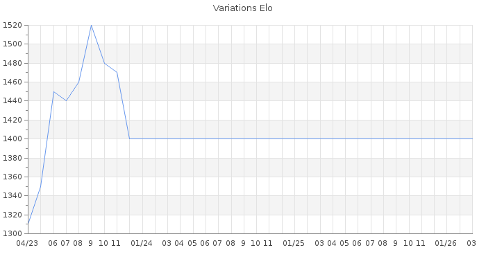 Date d'inscription : 06/04/13. Donateur pour EchecsEmail : Non ( Cliquez ici pour soutenir EchecsEmail. ) Elo non arrondi:1365.6 ( 471 sur 441 joueurs ) Nombre de victoires :191 Nombre de nulles :9 Nombre de défaites :251 Temps de réponse moyen par coup : 0J 13H 28M 58S ( Moyenne sur 0 coups ). Rd ( Un petit rd indique un elo fiable ) : 84 Magic Elo:1600 Magic Rd : 350 Elo maximum atteint ( en étant classé ) :1520 Elo maximum atteint cette année :0 Nombre coups joués : 15493 Classement coupe : Inactif Points coupe : 0 Classement Coupe Magic Chess : Inactif Points Coupe Magic Chess : 0 Tournoi échelle : Inactif. Tournois gagnés : 13/04/2019 : Cat 0 : Victoire dans le tournoi n°19326 30/03/2018 : Cat 0 : Victoire dans le tournoi n°17793 14/05/2013 : Cat 0 : Victoire dans le tournoi n°12347 Nombre de tournois gagnés :3