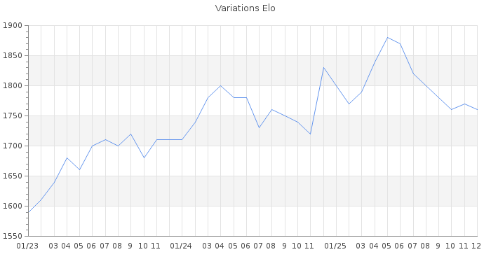 Date d'inscription : 21/02/10. Donateur pour EchecsEmail : Non ( Cliquez ici pour soutenir EchecsEmail. ) Elo non arrondi:1756.9 ( 256 sur 450 joueurs ) Nombre de victoires :1081 Nombre de nulles :169 Nombre de défaites :1484 Temps de réponse moyen par coup : 0J 11H 32M 42S ( Moyenne sur 397 coups ). Rd ( Un petit rd indique un elo fiable ) : 72 Magic Elo:1494.28 Magic Rd : 274 Elo maximum atteint ( en étant classé ) :2000 Elo maximum atteint cette année :1890 Nombre coups joués : 111900 Classement coupe : Inactif Points coupe : 0.03 Classement Coupe Magic Chess : Inactif Points Coupe Magic Chess : 0 Tournoi échelle : Inactif. Tournois gagnés : 10/05/2025 : Cat 3 : Victoire dans le tournoi n°26646 15/11/2024 : Cat 3 : Victoire dans le tournoi n°25997 05/01/2024 : Cat 3 : Victoire dans le tournoi n°25377 14/11/2023 : Cat 3 : Victoire dans le tournoi n°25302 02/06/2023 : Cat 3 : Victoire dans le tournoi n°24780 21/03/2023 : Cat 2 : Victoire dans le tournoi n°24625 18/03/2021 : Cat 3 : Victoire dans le tournoi n°22394 05/01/2021 : Cat 3 : Victoire dans le tournoi n°22067 20/06/2020 : Cat 3 : Victoire dans le tournoi n°21308 19/05/2020 : Cat 3 : Victoire dans le tournoi n°21253 25/09/2018 : Cat 3 : Victoire dans le tournoi n°18583 10/05/2018 : Cat 3 : Victoire dans le tournoi n°18063 12/06/2015 : Cat 4 : Victoire dans le tournoi n°17534 17/12/2014 : Cat 3 : Victoire dans le tournoi n°16457 01/11/2014 : Cat 3 : Victoire dans le tournoi n°16022 12/10/2014 : Cat 3 : Victoire dans le tournoi n°16046 29/03/2014 : Cat 3 : Victoire dans le tournoi n°14454 05/03/2014 : Cat 3 : Victoire dans le tournoi n°14397 30/05/2013 : Cat 3 : Victoire dans le tournoi n°12532 02/01/2013 : Cat 3 : Victoire dans le tournoi n°10995 25/12/2012 : Cat 4 : Victoire dans le tournoi n°11156 16/11/2012 : Cat 3 : Victoire dans le tournoi n°11011 10/09/2012 : Cat 3 : Victoire dans le tournoi n°10460 08/02/2012 : Cat 4 : Victoire dans le tournoi n°9249 06/02/2012 : Cat 4 : Victoire dans le tournoi n°9436 30/01/2012 : Cat 3 : Victoire dans le tournoi n°9656 29/10/2011 : Cat 4 : Victoire dans le tournoi n°9286 03/10/2011 : Cat 3 : Victoire dans le tournoi n°9126 27/03/2011 : Cat 3 : Victoire dans le tournoi n°8431 29/01/2011 : Cat 3 : Victoire dans le tournoi n°8186 26/01/2011 : Cat 3 : Victoire dans le tournoi n°8102 16/12/2010 : Cat 3 : Victoire dans le tournoi n°8037 09/10/2010 : Cat 3 : Victoire dans le tournoi n°7852 30/09/2010 : Cat 3 : Victoire dans le tournoi n°7824 25/09/2010 : Cat 2 : Victoire dans le tournoi n°7635 18/09/2010 : Cat 2 : Victoire dans le tournoi n°7692 25/07/2010 : Cat 2 : Victoire dans le tournoi n°7560 27/06/2010 : Cat 2 : Victoire dans le tournoi n°7500 10/06/2010 : Cat 2 : Victoire dans le tournoi n°7433 Nombre de tournois gagnés :39