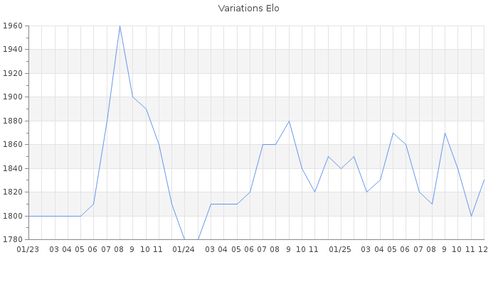 Date d'inscription : 23/04/10. Donateur pour EchecsEmail : Non ( Cliquez ici pour soutenir EchecsEmail. ) Elo non arrondi:1827.3 ( 212 sur 450 joueurs ) Nombre de victoires :930 Nombre de nulles :58 Nombre de défaites :572 Temps de réponse moyen par coup : 0J 11H 32M 28S ( Moyenne sur 950 coups ). Rd ( Un petit rd indique un elo fiable ) : 62 Magic Elo:1600 Magic Rd : 350 Elo maximum atteint ( en étant classé ) :2180 Elo maximum atteint cette année :1900 Nombre coups joués : 55529 Classement coupe : Inactif Points coupe : 0 Classement Coupe Magic Chess : Inactif Points Coupe Magic Chess : 0 Tournoi échelle : Nombre de tournois gagnés :0