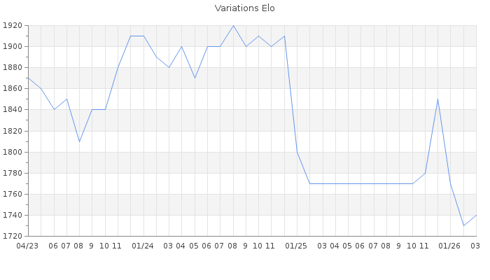 Date d'inscription : 08/12/19. Donateur pour EchecsEmail : Oui ( Cliquez ici pour soutenir EchecsEmail. ) Elo non arrondi:1735.4 ( 247 sur 442 joueurs ) Nombre de victoires :520 Nombre de nulles :45 Nombre de défaites :212 Temps de réponse moyen par coup : 0J 1H 59M 4S ( Moyenne sur 815 coups ). Rd ( Un petit rd indique un elo fiable ) : 67 Elo maximum atteint ( en étant classé ) :1980 Elo maximum atteint cette année :1820 Nombre coups joués : 34948 Classement coupe : Inactif Points coupe : 0 Classement Coupe Magic Chess : Inactif Points Coupe Magic Chess : 0 Tournoi échelle : Inactif. Nombre de tournois gagnés :0