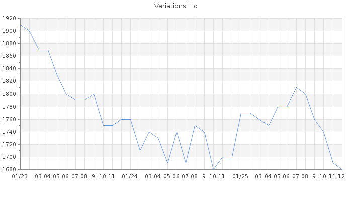Date d'inscription : 26/08/18. Donateur pour EchecsEmail : Non ( Cliquez ici pour soutenir EchecsEmail. ) Elo non arrondi:1683.7 ( 285 sur 449 joueurs ) Nombre de victoires :302 Nombre de nulles :82 Nombre de défaites :321 Temps de réponse moyen par coup : 0J 3H 22M 2S ( Moyenne sur 1150 coups ). Rd ( Un petit rd indique un elo fiable ) : 59 Magic Elo:1433.66 Magic Rd : 157 Elo maximum atteint ( en étant classé ) :1940 Elo maximum atteint cette année :1830 Nombre coups joués : 30969 Inscrit dans l' équipe:No Game No Life Classement coupe : Inactif, date de la dernière qualification : 29/05/22 Points coupe : 18.24 Classement Coupe Magic Chess : Inactif Points Coupe Magic Chess : 0 Tournoi échelle : Division 2 : 4 Tournois gagnés : 13/07/2024 : Cat 4 : Victoire CC Jan22 Asc 15/07/2019 : Cat 1 : Victoire CC Avr19 Asc 06/11/2018 : Cat 2 : Premier au tournoi multi Automne 2018 n°2 Nombre de tournois gagnés :3