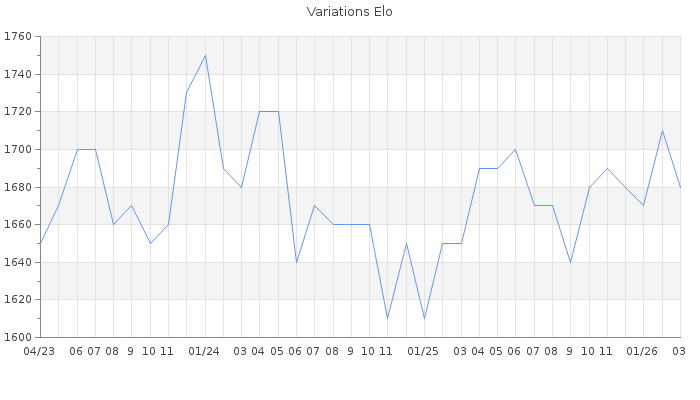 Date d'inscription : 29/12/08. Donateur pour EchecsEmail : Non ( Cliquez ici pour soutenir EchecsEmail. ) Elo non arrondi:1675.9 ( 277 sur 442 joueurs ) Nombre de victoires :1689 Nombre de nulles :100 Nombre de défaites :1843 Temps de réponse moyen par coup : 0J 6H 51M 6S ( Moyenne sur 1621 coups ). Rd ( Un petit rd indique un elo fiable ) : 56 Magic Elo:1419.94 Magic Rd : 82 Elo maximum atteint ( en étant classé ) :1820 Elo maximum atteint cette année :1710 Nombre coups joués : 130605 Inscrit dans l' équipe:Avalon Classement coupe : Inactif Points coupe : 0.02 Classement Coupe Magic Chess : Inactif Points Coupe Magic Chess : 0 Tournoi échelle : Inactif. Tournois gagnés : 25/10/2025 : Cat 2 : Victoire dans le tournoi n°27018 22/09/2025 : Cat 3 : Victoire dans le tournoi n°26967 26/08/2025 : Cat 3 : Victoire dans le tournoi n°26870 18/03/2025 : Cat 2 : Victoire dans le tournoi n°26474 01/03/2025 : Cat 2 : Victoire dans le tournoi n°26491 28/12/2023 : Cat 3 : Victoire dans le tournoi n°25442 08/11/2023 : Cat 2 : Victoire dans le tournoi n°25312 18/05/2022 : Cat 3 : Victoire dans le tournoi n°23880 17/10/2017 : Cat 0 : Premier au tournoi multi Automne 2017 n°2 05/09/2015 : Cat 2 : Victoire dans le tournoi n°18151 Nombre de tournois gagnés :10