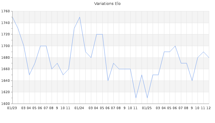 Date d'inscription : 29/12/08. Donateur pour EchecsEmail : Non ( Cliquez ici pour soutenir EchecsEmail. ) Elo non arrondi:1683.5 ( 282 sur 450 joueurs ) Nombre de victoires :1663 Nombre de nulles :99 Nombre de défaites :1813 Temps de réponse moyen par coup : 0J 5H 16M 4S ( Moyenne sur 1899 coups ). Rd ( Un petit rd indique un elo fiable ) : 50 Magic Elo:1419.94 Magic Rd : 82 Elo maximum atteint ( en étant classé ) :1820 Elo maximum atteint cette année :1710 Nombre coups joués : 128482 Classement coupe : Inactif Points coupe : 0.03 Classement Coupe Magic Chess : Inactif Points Coupe Magic Chess : 0 Tournoi échelle : Inactif. Tournois gagnés : 25/10/2025 : Cat 2 : Victoire dans le tournoi n°27018 22/09/2025 : Cat 3 : Victoire dans le tournoi n°26967 26/08/2025 : Cat 3 : Victoire dans le tournoi n°26870 18/03/2025 : Cat 2 : Victoire dans le tournoi n°26474 01/03/2025 : Cat 2 : Victoire dans le tournoi n°26491 28/12/2023 : Cat 3 : Victoire dans le tournoi n°25442 08/11/2023 : Cat 2 : Victoire dans le tournoi n°25312 18/05/2022 : Cat 3 : Victoire dans le tournoi n°23880 17/10/2017 : Cat 0 : Premier au tournoi multi Automne 2017 n°2 05/09/2015 : Cat 2 : Victoire dans le tournoi n°18151 Nombre de tournois gagnés :10