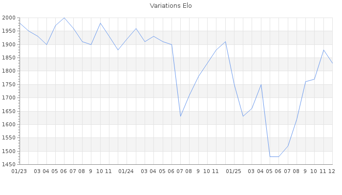 Date d'inscription : 01/02/07. Donateur pour EchecsEmail : Non ( Cliquez ici pour soutenir EchecsEmail. ) Elo non arrondi:1834.2 ( 208 sur 449 joueurs ) Nombre de victoires :3114 Nombre de nulles :668 Nombre de défaites :3066 Temps de réponse moyen par coup : 0J 16H 10M 31S ( Moyenne sur 5472 coups ). Rd ( Un petit rd indique un elo fiable ) : 50 Magic Elo:1294 Magic Rd : 206 Elo maximum atteint ( en étant classé ) :2210 Elo maximum atteint cette année :1900 Nombre coups joués : 225582 Classement coupe : Inactif Points coupe : 0 Classement Coupe Magic Chess : Inactif Points Coupe Magic Chess : 0 Tournoi échelle : Inactif. Tournois gagnés : 03/12/2025 : Cat 2 : Victoire dans le tournoi n°26883 29/11/2025 : Cat 3 : Victoire dans le tournoi n°27022 23/11/2025 : Cat 2 : Victoire dans le tournoi n°26938 01/11/2025 : Cat 2 : Victoire dans le tournoi n°26821 09/10/2025 : Cat 2 : Victoire dans le tournoi n°26925 02/08/2025 : Cat 2 : Victoire dans le tournoi n°26752 22/11/2024 : Cat 3 : Victoire dans le tournoi n°25970 21/11/2024 : Cat 3 : Victoire dans le tournoi n°25971 22/07/2024 : Cat 4 : Victoire dans le tournoi n°25553 09/03/2024 : Cat 4 : Victoire dans le tournoi n°25188 18/01/2024 : Cat 4 : Victoire dans le tournoi n°25025 08/11/2023 : Cat 4 : Victoire dans le tournoi n°24888 18/10/2023 : Cat 4 : Victoire dans le tournoi n°24926 31/05/2023 : Cat 4 : Victoire dans le tournoi n°24585 30/03/2023 : Cat 4 : Victoire dans le tournoi n°24446 17/03/2023 : Cat 4 : Victoire dans le tournoi n°24313 20/01/2023 : Cat 4 : Victoire dans le tournoi n°24249 09/10/2022 : Cat 4 : Victoire dans le tournoi n°24054 21/09/2022 : Cat 4 : Victoire dans le tournoi n°23754 20/09/2022 : Cat 4 : Victoire dans le tournoi n°23773 04/09/2022 : Cat 4 : Victoire dans le tournoi n°23393 19/07/2022 : Cat 3 : Victoire dans le tournoi n°23153 09/07/2022 : Cat 4 : Victoire dans le tournoi n°23599 08/07/2022 : Cat 4 : Victoire dans le tournoi n°23724 28/05/2022 : Cat 3 : Victoire dans le tournoi n°23325 25/05/2022 : Cat 3 : Victoire dans le tournoi n°23297 23/04/2022 : Cat 4 : Victoire dans le tournoi n°23367 03/04/2022 : Cat 4 : Victoire dans le tournoi n°22476 21/12/2021 : Cat 3 : Victoire dans le tournoi n°23139 22/11/2021 : Cat 4 : Victoire dans le tournoi n°21830 05/11/2021 : Cat 3 : Victoire dans le tournoi n°23125 23/08/2021 : Cat 4 : Victoire dans le tournoi n°22187 11/07/2021 : Cat 4 : Victoire dans le tournoi n°22257 30/06/2021 : Cat 4 : Victoire dans le tournoi n°22389 24/06/2021 : Cat 4 : Victoire dans le tournoi n°21771 23/06/2021 : Cat 4 : Victoire dans le tournoi n°22292 14/05/2021 : Cat 4 : Victoire dans le tournoi n°21867 18/04/2021 : Cat 3 : Victoire dans le tournoi n°21693 30/11/2020 : Cat 3 : Victoire dans le tournoi n°21759 05/08/2020 : Cat 3 : Victoire dans le tournoi n°20847 19/05/2020 : Cat 3 : Victoire dans le tournoi n°20860 07/04/2020 : Cat 4 : Victoire dans le tournoi n°20040 21/03/2020 : Cat 4 : Victoire dans le tournoi n°20315 10/02/2020 : Cat 3 : Victoire dans le tournoi n°19891 13/12/2019 : Cat 3 : Victoire dans le tournoi n°19948 07/11/2019 : Cat 3 : Victoire dans le tournoi n°19960 18/10/2019 : Cat 4 : Victoire dans le tournoi n°19259 18/10/2019 : Cat 4 : Victoire dans le tournoi n°19595 15/06/2019 : Cat 4 : Victoire dans le tournoi n°19550 14/06/2019 : Cat 4 : Victoire dans le tournoi n°19698 06/06/2019 : Cat 4 : Victoire dans le tournoi n°19678 22/05/2019 : Cat 4 : Victoire dans le tournoi n°19649 18/05/2019 : Cat 4 : Victoire dans le tournoi n°19042 03/05/2019 : Cat 4 : Victoire dans le tournoi n°19581 21/04/2019 : Cat 4 : Victoire dans le tournoi n°19442 03/04/2019 : Cat 4 : Victoire dans le tournoi n°18820 13/03/2019 : Cat 4 : Victoire dans le tournoi n°18578 06/03/2019 : Cat 4 : Victoire dans le tournoi n°19304 27/02/2019 : Cat 4 : Victoire dans le tournoi n°19159 07/01/2019 : Cat 4 : Victoire dans le tournoi n°19083 22/12/2018 : Cat 4 : Victoire dans le tournoi n°19013 18/12/2018 : Cat 3 : Victoire dans le tournoi n°18993 17/12/2018 : Cat 3 : Victoire dans le tournoi n°19056 16/12/2018 : Cat 3 : Victoire dans le tournoi n°18962 17/11/2018 : Cat 3 : Victoire dans le tournoi n°18970 15/11/2018 : Cat 3 : Victoire dans le tournoi n°18958 13/11/2018 : Cat 3 : Victoire dans le tournoi n°18979 17/08/2018 : Cat 4 : Victoire dans le tournoi n°17943 06/08/2018 : Cat 4 : Victoire dans le tournoi n°18071 04/08/2018 : Cat 4 : Victoire dans le tournoi n°17999 02/08/2018 : Cat 4 : Victoire dans le tournoi n°18380 22/07/2018 : Cat 4 : Victoire dans le tournoi n°17974 25/06/2018 : Cat 4 : Victoire dans le tournoi n°17956 14/06/2018 : Cat 4 : Victoire dans le tournoi n°18035 09/06/2018 : Cat 4 : Victoire dans le tournoi n°17879 31/05/2018 : Cat 4 : Victoire dans le tournoi n°17830 26/05/2018 : Cat 4 : Victoire dans le tournoi n°17870 02/05/2018 : Cat 4 : Victoire dans le tournoi n°17802 23/04/2018 : Cat 4 : Victoire dans le tournoi n°17819 17/04/2018 : Cat 3 : Victoire dans le tournoi n°17464 11/04/2018 : Cat 4 : Victoire dans le tournoi n°17760 16/03/2018 : Cat 4 : Victoire dans le tournoi n°17667 08/03/2018 : Cat 4 : Victoire dans le tournoi n°17796 21/02/2018 : Cat 4 : Victoire dans le tournoi n°17549 15/02/2018 : Cat 3 : Victoire dans le tournoi n°17597 13/02/2018 : Cat 4 : Victoire dans le tournoi n°17516 02/02/2018 : Cat 4 : Victoire dans le tournoi n°17459 10/01/2018 : Cat 3 : Victoire dans le tournoi n°17445 07/01/2018 : Cat 3 : Victoire dans le tournoi n°17430 06/01/2018 : Cat 3 : Victoire dans le tournoi n°17365 03/11/2017 : Cat 4 : Victoire dans le tournoi n°16640 30/04/2017 : Cat 3 : Victoire dans le tournoi n°15238 22/03/2017 : Cat 4 : Victoire dans le tournoi n°15941 12/03/2017 : Cat 4 : Victoire dans le tournoi n°15282 01/03/2017 : Cat 4 : Victoire dans le tournoi n°15671 01/03/2017 : Cat 4 : Victoire dans le tournoi n°14901 11/02/2017 : Cat 4 : Victoire dans le tournoi n°15303 20/01/201