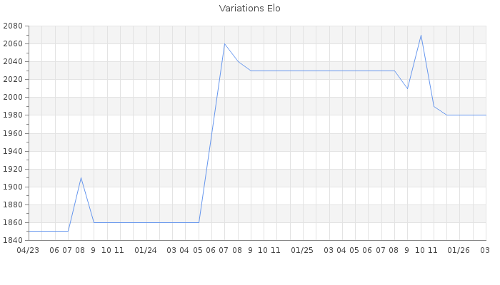 Date d'inscription : 03/12/21. Donateur pour EchecsEmail : Non ( Cliquez ici pour soutenir EchecsEmail. ) Elo non arrondi:1971.2 ( 142 sur 442 joueurs ) Nombre de victoires :245 Nombre de nulles :35 Nombre de défaites :217 Temps de réponse moyen par coup : 0J 1H 12M 34S ( Moyenne sur 349 coups ). Rd ( Un petit rd indique un elo fiable ) : 66 Magic Elo:1700 Magic Rd : 350 Elo maximum atteint ( en étant classé ) :2140 Elo maximum atteint cette année :1980 Nombre coups joués : 17316 Classement coupe : 40 Points coupe : 821.32 Classement Coupe Magic Chess : Inactif Points Coupe Magic Chess : 0 Tournoi échelle : Inactif. Tournois gagnés : 15/10/2025 : Cat 4 : Victoire dans le tournoi n°27125 04/07/2024 : Cat 3 : Victoire dans le tournoi n°25926 28/08/2023 : Cat 3 : Victoire dans le tournoi n°25167 27/08/2023 : Cat 4 : Victoire dans le tournoi n°25166 31/03/2022 : Cat 4 : Victoire dans le tournoi n°23781 26/03/2022 : Cat 4 : Victoire dans le tournoi n°23708 26/03/2022 : Cat 4 : Victoire dans le tournoi n°23772 21/02/2022 : Cat 4 : Victoire dans le tournoi n°23642 25/01/2022 : Cat 4 : Victoire dans le tournoi n°23565 20/01/2022 : Cat 4 : Victoire dans le tournoi n°23570 17/01/2022 : Cat 4 : Victoire dans le tournoi n°23515 15/01/2022 : Cat 4 : Victoire dans le tournoi n°23548 21/12/2021 : Cat 3 : Victoire dans le tournoi n°23429 07/12/2021 : Cat 2 : Victoire dans le tournoi n°23423 Nombre de tournois gagnés :14
