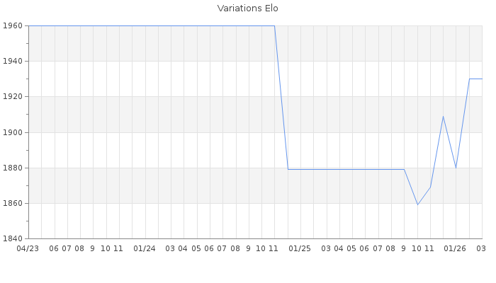 Date d'inscription : 23/09/14. Donateur pour EchecsEmail : Non ( Cliquez ici pour soutenir EchecsEmail. ) Elo non arrondi:1934.7 ( 155 sur 442 joueurs ) Nombre de victoires :376 Nombre de nulles :14 Nombre de défaites :51 Temps de réponse moyen par coup : 0J 2H 14M 3S ( Moyenne sur 542 coups ). Rd ( Un petit rd indique un elo fiable ) : 108 Elo maximum atteint ( en étant classé ) :2290 Elo maximum atteint cette année :1930 Nombre coups joués : 14364 Classement coupe : Inactif Points coupe : 0 Classement Coupe Magic Chess : Inactif Points Coupe Magic Chess : 0 Tournoi échelle : Inactif. Nombre de tournois gagnés :0