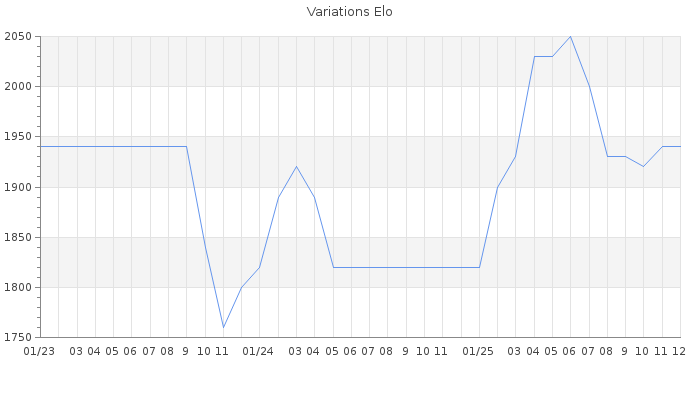Date d'inscription : 04/09/21. Donateur pour EchecsEmail : Non ( Cliquez ici pour soutenir EchecsEmail. ) Elo non arrondi:1944 ( 158 sur 450 joueurs ) Nombre de victoires :50 Nombre de nulles :3 Nombre de défaites :20 Temps de réponse moyen par coup : 0J 13H 8M 3S ( Moyenne sur 155 coups ). Rd ( Un petit rd indique un elo fiable ) : 88 Elo maximum atteint ( en étant classé ) :2050 Elo maximum atteint cette année :2050 Nombre coups joués : 2434 Classement coupe : Inactif Points coupe : 0 Classement Coupe Magic Chess : Inactif Points Coupe Magic Chess : 0 Tournoi échelle : Inactif. Tournois gagnés : 30/03/2025 : Cat 3 : Victoire dans le tournoi n°26475 28/03/2024 : Cat 3 : Victoire dans le tournoi n°25585 21/02/2024 : Cat 3 : Victoire dans le tournoi n°25519 03/02/2024 : Cat 3 : Victoire dans le tournoi n°25351 10/02/2022 : Cat 4 : Victoire dans le tournoi n°23477 18/12/2021 : Cat 3 : Victoire dans le tournoi n°23289 Nombre de tournois gagnés :6