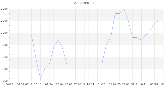 Date d'inscription : 04/09/21. Donateur pour EchecsEmail : Non ( Cliquez ici pour soutenir EchecsEmail. ) Elo non arrondi:2001.1 ( 128 sur 442 joueurs ) Nombre de victoires :53 Nombre de nulles :4 Nombre de défaites :20 Temps de réponse moyen par coup : 0J 15H 23M 9S ( Moyenne sur 126 coups ). Rd ( Un petit rd indique un elo fiable ) : 92 Elo maximum atteint ( en étant classé ) :2050 Elo maximum atteint cette année :2000 Nombre coups joués : 2627 Classement coupe : Inactif Points coupe : 0 Classement Coupe Magic Chess : Inactif Points Coupe Magic Chess : 0 Tournoi échelle : Inactif. Tournois gagnés : 12/02/2026 : Cat 4 : Victoire dans le tournoi n°27307 30/03/2025 : Cat 3 : Victoire dans le tournoi n°26475 28/03/2024 : Cat 3 : Victoire dans le tournoi n°25585 21/02/2024 : Cat 3 : Victoire dans le tournoi n°25519 03/02/2024 : Cat 3 : Victoire dans le tournoi n°25351 10/02/2022 : Cat 4 : Victoire dans le tournoi n°23477 18/12/2021 : Cat 3 : Victoire dans le tournoi n°23289 Nombre de tournois gagnés :7