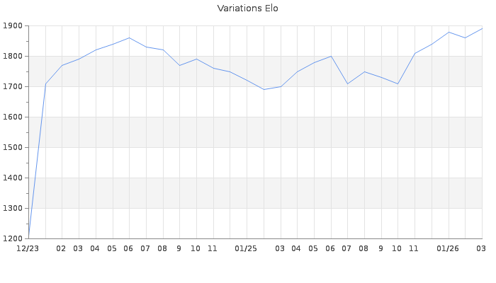 Date d'inscription : 11/12/23. Donateur pour EchecsEmail : Non ( Cliquez ici pour soutenir EchecsEmail. ) Elo non arrondi:1890.6 ( 179 sur 442 joueurs ) Nombre de victoires :215 Nombre de nulles :48 Nombre de défaites :132 Temps de réponse moyen par coup : 0J 5H 46M 20S ( Moyenne sur 1773 coups ). Rd ( Un petit rd indique un elo fiable ) : 54 Magic Elo:1700 Magic Rd : 350 Elo maximum atteint ( en étant classé ) :1890 Elo maximum atteint cette année :1890 Nombre coups joués : 14388 Inscrit dans l' équipe:La Diagonale du Fou Classement coupe : Inactif Points coupe : 0 Classement Coupe Magic Chess : Inactif Points Coupe Magic Chess : 0 Tournoi échelle : Inactif. Tournois gagnés : 20/02/2024 : Cat 1 : Victoire dans le tournoi n°25461 Nombre de tournois gagnés :1