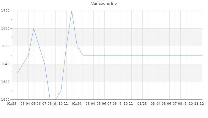 Date d'inscription : 25/12/15. Donateur pour EchecsEmail : Non ( Cliquez ici pour soutenir EchecsEmail. ) Elo non arrondi:1620 ( 347 sur 452 joueurs ) Nombre de victoires :731 Nombre de nulles :109 Nombre de défaites :1007 Temps de réponse moyen par coup : 0J 18H 57M 3S ( Moyenne sur 0 coups ). Rd ( Un petit rd indique un elo fiable ) : 67 Magic Elo:1600 Magic Rd : 350 Elo maximum atteint ( en étant classé ) :1920 Elo maximum atteint cette année :0 Nombre coups joués : 59612 Classement coupe : 101 Points coupe : 96.35 Classement Coupe Magic Chess : Inactif Points Coupe Magic Chess : 0 Tournoi échelle : Inactif. Tournois gagnés : 01/03/2021 : Cat 2 : Premier au tournoi multi Saint-Valentin 2021 n°3 17/01/2021 : Cat 2 : Premier au tournoi multi Noël 2020 n°2 08/03/2020 : Cat 2 : Premier au tournoi multi Saint-Valentin 2020 n°5 14/06/2019 : Cat 4 : Premier au tournoi multi Saint-Valentin 2019 n°6 27/09/2017 : Cat 2 : Premier au tournoi multi Eté 2017 n°1 28/08/2017 : Cat 2 : Premier au tournoi multi Eté 2017 n°4 Nombre de tournois gagnés :10