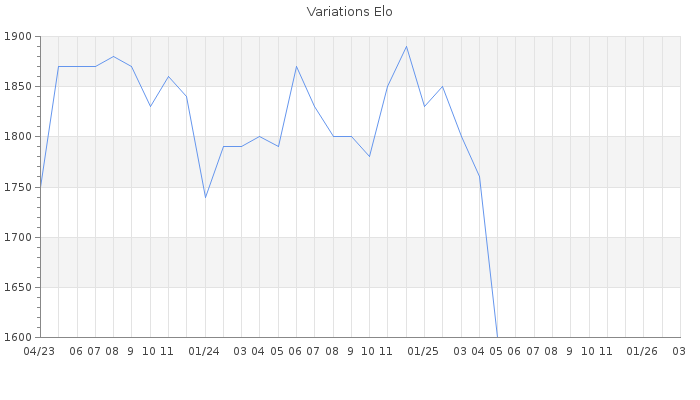 Date d'inscription : 09/03/19. Donateur pour EchecsEmail : Non ( Cliquez ici pour soutenir EchecsEmail. ) Elo non arrondi:1574.5 ( 356 sur 441 joueurs ) Nombre de victoires :655 Nombre de nulles :55 Nombre de défaites :734 Temps de réponse moyen par coup : 0J 19H 4M 12S ( Moyenne sur 20 coups ). Rd ( Un petit rd indique un elo fiable ) : 50 Magic Elo:1812.73 Magic Rd : 281 Elo maximum atteint ( en étant classé ) :1940 Elo maximum atteint cette année :0 Nombre coups joués : 58356 Classement coupe : Inactif, date de la dernière qualification : 12/10/23 Points coupe : 8.39 Classement Coupe Magic Chess : Inactif Points Coupe Magic Chess : 0 Tournoi échelle : Inactif. Tournois gagnés : 06/03/2025 : Cat 3 : Victoire dans le tournoi n°26398 13/01/2025 : Cat 3 : Victoire dans le tournoi n°26341 12/01/2025 : Cat 3 : Victoire dans le tournoi n°26328 29/12/2024 : Cat 3 : Victoire dans le tournoi n°26212 24/12/2024 : Cat 3 : Victoire dans le tournoi n°26220 12/12/2024 : Cat 3 : Victoire dans le tournoi n°26104 20/11/2024 : Cat 3 : Victoire dans le tournoi n°26096 01/10/2024 : Cat 3 : Victoire dans le tournoi n°26016 06/07/2024 : Cat 3 : Victoire dans le tournoi n°25649 22/06/2024 : Cat 3 : Victoire dans le tournoi n°25575 08/09/2023 : Cat 4 : Victoire dans le tournoi n°24939 08/09/2023 : Cat 3 : Victoire dans le tournoi n°24955 26/08/2023 : Cat 4 : Victoire dans le tournoi n°24987 05/06/2023 : Cat 2 : Victoire dans le tournoi n°24567 04/06/2023 : Cat 4 : Victoire dans le tournoi n°24934 31/05/2023 : Cat 3 : Victoire dans le tournoi n°24708 29/05/2023 : Cat 3 : Victoire dans le tournoi n°24890 21/05/2023 : Cat 3 : Victoire dans le tournoi n°24688 12/05/2023 : Cat 3 : Victoire dans le tournoi n°24628 08/05/2023 : Cat 3 : Victoire dans le tournoi n°24808 05/04/2023 : Cat 2 : Victoire CC Jan23 Asc 14/02/2023 : Cat 2 : Victoire dans le tournoi n°24554 02/02/2023 : Cat 2 : Victoire dans le tournoi n°24531 16/03/2022 : Cat 3 : Victoire dans le tournoi n°23488 28/11/2021 : Cat 3 : Victoire dans le tournoi n°23344 28/11/2021 : Cat 3 : Victoire dans le tournoi n°23360 25/08/2021 : Cat 4 : Victoire dans le tournoi n°22780 27/04/2021 : Cat 3 : Victoire dans le tournoi n°22647 23/04/2021 : Cat 3 : Victoire dans le tournoi n°22574 22/04/2021 : Cat 3 : Victoire dans le tournoi n°22517 25/03/2021 : Cat 3 : Victoire dans le tournoi n°22477 28/01/2021 : Cat 1 : Victoire dans le tournoi n°21358 14/12/2020 : Cat 2 : Victoire dans le tournoi n°21833 29/09/2020 : Cat 2 : Victoire dans le tournoi n°21775 30/09/2019 : Cat 2 : Victoire dans le tournoi n°19620 31/08/2019 : Cat 1 : Victoire dans le tournoi n°19311 31/08/2019 : Cat 3 : Victoire dans le tournoi n°19826 07/06/2019 : Cat 2 : Victoire dans le tournoi n°19701 06/06/2019 : Cat 2 : Victoire dans le tournoi n°19648 29/05/2019 : Cat 3 : Victoire dans le tournoi n°19654 29/05/2019 : Cat 2 : Victoire dans le tournoi n°19536 02/05/2019 : Cat 3 : Victoire dans le tournoi n°19561 28/04/2019 : Cat 3 : Victoire dans le tournoi n°19570 24/04/2019 : Cat 2 : Victoire dans le tournoi n°19516 Nombre de tournois gagnés :44