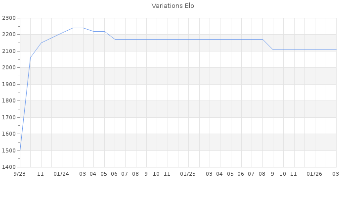 Date d'inscription : 28/09/23. Donateur pour EchecsEmail : Non ( Cliquez ici pour soutenir EchecsEmail. ) Elo non arrondi:2095.9 ( 90 sur 442 joueurs ) Nombre de victoires :83 Nombre de nulles :7 Nombre de défaites :44 Temps de réponse moyen par coup : 0J 1H 19M 43S ( Moyenne sur 0 coups ). Rd ( Un petit rd indique un elo fiable ) : 131 Elo maximum atteint ( en étant classé ) :2260 Elo maximum atteint cette année :0 Nombre coups joués : 4077 Classement coupe : 84 Points coupe : 118.81 Classement Coupe Magic Chess : Inactif Points Coupe Magic Chess : 0 Tournoi échelle : Inactif. Tournois gagnés : 11/04/2024 : Cat 5 : Victoire dans le tournoi n°25478 04/02/2024 : Cat 5 : Victoire dans le tournoi n°25344 27/10/2023 : Cat 4 : Victoire dans le tournoi n°25279 06/10/2023 : Cat 2 : Victoire dans le tournoi n°25268 Nombre de tournois gagnés :4