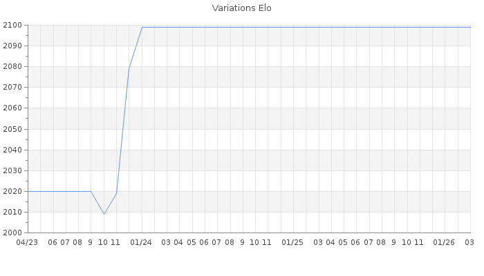 Date d'inscription : 19/02/17. Donateur pour EchecsEmail : Non ( Cliquez ici pour soutenir EchecsEmail. ) Elo non arrondi:2065.9 ( 109 sur 441 joueurs ) Nombre de victoires :86 Nombre de nulles :5 Nombre de défaites :8 Temps de réponse moyen par coup : 0J 17H 3M 35S ( Moyenne sur 0 coups ). Rd ( Un petit rd indique un elo fiable ) : 151 Elo maximum atteint ( en étant classé ) :2090 Elo maximum atteint cette année :0 Nombre coups joués : 3191 Classement coupe : Inactif Points coupe : 0 Classement Coupe Magic Chess : Inactif Points Coupe Magic Chess : 0 Tournoi échelle : Tournois gagnés : 07/04/2017 : Cat 1 : Victoire dans le tournoi n°16347 Nombre de tournois gagnés :1