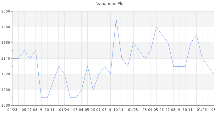 Date d'inscription : 06/04/09. Donateur pour EchecsEmail : Non ( Cliquez ici pour soutenir EchecsEmail. ) Elo non arrondi:1923.9 ( 158 sur 442 joueurs ) Nombre de victoires :1526 Nombre de nulles :185 Nombre de défaites :1005 Temps de réponse moyen par coup : 0J 5H 32M 12S ( Moyenne sur 880 coups ). Rd ( Un petit rd indique un elo fiable ) : 65 Magic Elo:1600 Magic Rd : 350 Elo maximum atteint ( en étant classé ) :2050 Elo maximum atteint cette année :1980 Nombre coups joués : 97014 Inscrit dans l' équipe:Pirates du Mat Classement coupe : Inactif Points coupe : 0 Classement Coupe Magic Chess : Inactif Points Coupe Magic Chess : 0 Tournoi échelle : Inactif. Tournois gagnés : 06/05/2025 : Cat 4 : Victoire dans le tournoi n°26711 18/01/2025 : Cat 4 : Victoire dans le tournoi n°26401 02/07/2024 : Cat 3 : Victoire dans le tournoi n°25917 25/11/2023 : Cat 3 : Victoire dans le tournoi n°25390 11/11/2021 : Cat 4 : Victoire dans le tournoi n°23211 23/09/2021 : Cat 4 : Victoire dans le tournoi n°23156 17/03/2021 : Cat 4 : Victoire dans le tournoi n°22516 28/02/2021 : Cat 3 : Victoire dans le tournoi n°22486 03/01/2021 : Cat 3 : Victoire dans le tournoi n°22229 15/12/2020 : Cat 3 : Victoire dans le tournoi n°22179 28/10/2020 : Cat 3 : Victoire dans le tournoi n°21928 03/10/2020 : Cat 3 : Victoire dans le tournoi n°21781 11/01/2020 : Cat 4 : Victoire dans le tournoi n°20468 19/12/2019 : Cat 4 : Victoire dans le tournoi n°20550 13/07/2019 : Cat 4 : Victoire dans le tournoi n°19844 19/04/2019 : Cat 3 : Victoire dans le tournoi n°19180 11/04/2019 : Cat 3 : Victoire dans le tournoi n°19221 01/09/2018 : Cat 3 : Victoire dans le tournoi n°18521 05/08/2018 : Cat 3 : Victoire dans le tournoi n°18475 15/02/2018 : Cat 3 : Victoire dans le tournoi n°17444 13/09/2017 : Cat 4 : Victoire dans le tournoi n°17025 03/09/2017 : Cat 3 : Victoire dans le tournoi n°16854 10/01/2017 : Cat 3 : Victoire dans le tournoi n°15769 12/05/2016 : Cat 4 : Victoire dans le tournoi n°14833 17/09/2015 : Cat 3 : Victoire dans le tournoi n°18068 24/04/2015 : Cat 3 : Victoire dans le tournoi n°17512 10/12/2014 : Cat 3 : Victoire dans le tournoi n°16566 21/11/2014 : Cat 3 : Victoire dans le tournoi n°16393 21/10/2014 : Cat 3 : Victoire dans le tournoi n°16119 30/09/2014 : Cat 3 : Victoire dans le tournoi n°15885 18/09/2014 : Cat 3 : Victoire dans le tournoi n°16023 02/07/2014 : Cat 3 : Victoire dans le tournoi n°15491 29/12/2013 : Cat 3 : Victoire dans le tournoi n°14186 06/12/2013 : Cat 3 : Victoire dans le tournoi n°13681 12/09/2013 : Cat 3 : Victoire dans le tournoi n°13331 21/08/2013 : Cat 3 : Victoire dans le tournoi n°12809 19/08/2013 : Cat 3 : Victoire dans le tournoi n°13122 16/04/2013 : Cat 4 : Victoire dans le tournoi n°12255 29/03/2013 : Cat 3 : Victoire dans le tournoi n°12049 08/03/2013 : Cat 3 : Victoire dans le tournoi n°11512 29/12/2012 : Cat 3 : Victoire dans le tournoi n°11427 20/12/2012 : Cat 3 : Victoire dans le tournoi n°11305 Nombre de tournois gagnés :42
