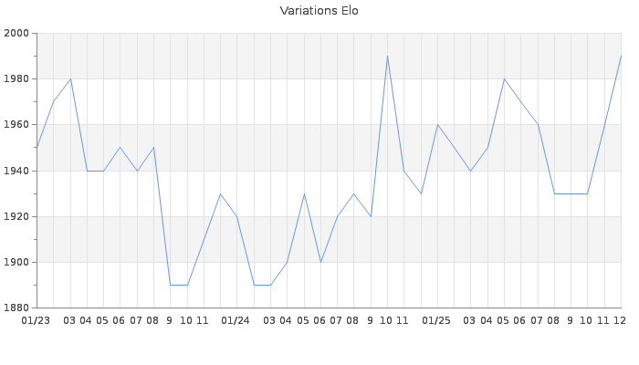 Date d'inscription : 06/04/09. Donateur pour EchecsEmail : Non ( Cliquez ici pour soutenir EchecsEmail. ) Elo non arrondi:1988.6 ( 121 sur 449 joueurs ) Nombre de victoires :1517 Nombre de nulles :182 Nombre de défaites :993 Temps de réponse moyen par coup : 0J 3H 28M 14S ( Moyenne sur 1108 coups ). Rd ( Un petit rd indique un elo fiable ) : 59 Magic Elo:1600 Magic Rd : 350 Elo maximum atteint ( en étant classé ) :2050 Elo maximum atteint cette année :2000 Nombre coups joués : 95985 Inscrit dans l' équipe:Pirates du Mat Classement coupe : Inactif Points coupe : 0 Classement Coupe Magic Chess : Inactif Points Coupe Magic Chess : 0 Tournoi échelle : Inactif. Tournois gagnés : 06/05/2025 : Cat 4 : Victoire dans le tournoi n°26711 18/01/2025 : Cat 4 : Victoire dans le tournoi n°26401 02/07/2024 : Cat 3 : Victoire dans le tournoi n°25917 25/11/2023 : Cat 3 : Victoire dans le tournoi n°25390 11/11/2021 : Cat 4 : Victoire dans le tournoi n°23211 23/09/2021 : Cat 4 : Victoire dans le tournoi n°23156 17/03/2021 : Cat 4 : Victoire dans le tournoi n°22516 28/02/2021 : Cat 3 : Victoire dans le tournoi n°22486 03/01/2021 : Cat 3 : Victoire dans le tournoi n°22229 15/12/2020 : Cat 3 : Victoire dans le tournoi n°22179 28/10/2020 : Cat 3 : Victoire dans le tournoi n°21928 03/10/2020 : Cat 3 : Victoire dans le tournoi n°21781 11/01/2020 : Cat 4 : Victoire dans le tournoi n°20468 19/12/2019 : Cat 4 : Victoire dans le tournoi n°20550 13/07/2019 : Cat 4 : Victoire dans le tournoi n°19844 19/04/2019 : Cat 3 : Victoire dans le tournoi n°19180 11/04/2019 : Cat 3 : Victoire dans le tournoi n°19221 01/09/2018 : Cat 3 : Victoire dans le tournoi n°18521 05/08/2018 : Cat 3 : Victoire dans le tournoi n°18475 15/02/2018 : Cat 3 : Victoire dans le tournoi n°17444 13/09/2017 : Cat 4 : Victoire dans le tournoi n°17025 03/09/2017 : Cat 3 : Victoire dans le tournoi n°16854 10/01/2017 : Cat 3 : Victoire dans le tournoi n°15769 12/05/2016 : Cat 4 : Victoire dans le tournoi n°14833 17/09/2015 : Cat 3 : Victoire dans le tournoi n°18068 24/04/2015 : Cat 3 : Victoire dans le tournoi n°17512 10/12/2014 : Cat 3 : Victoire dans le tournoi n°16566 21/11/2014 : Cat 3 : Victoire dans le tournoi n°16393 21/10/2014 : Cat 3 : Victoire dans le tournoi n°16119 30/09/2014 : Cat 3 : Victoire dans le tournoi n°15885 18/09/2014 : Cat 3 : Victoire dans le tournoi n°16023 02/07/2014 : Cat 3 : Victoire dans le tournoi n°15491 29/12/2013 : Cat 3 : Victoire dans le tournoi n°14186 06/12/2013 : Cat 3 : Victoire dans le tournoi n°13681 12/09/2013 : Cat 3 : Victoire dans le tournoi n°13331 21/08/2013 : Cat 3 : Victoire dans le tournoi n°12809 19/08/2013 : Cat 3 : Victoire dans le tournoi n°13122 16/04/2013 : Cat 4 : Victoire dans le tournoi n°12255 29/03/2013 : Cat 3 : Victoire dans le tournoi n°12049 08/03/2013 : Cat 3 : Victoire dans le tournoi n°11512 29/12/2012 : Cat 3 : Victoire dans le tournoi n°11427 20/12/2012 : Cat 3 : Victoire dans le tournoi n°11305 Nombre de tournois gagnés :42