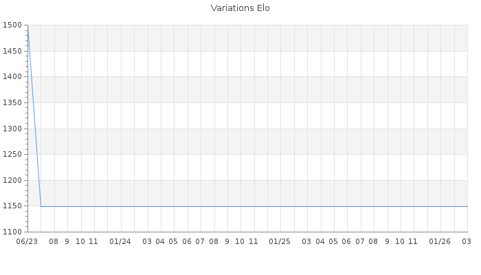 Date d'inscription : 14/06/23. Donateur pour EchecsEmail : Non ( Cliquez ici pour soutenir EchecsEmail. ) Elo non arrondi:1108.3 ( 509 sur 442 joueurs ) Nombre de victoires :0 Nombre de nulles :0 Nombre de défaites :4 Rd ( Un petit rd indique un elo fiable ) : 181 Elo maximum atteint ( en étant classé ) :0 Elo maximum atteint cette année :0 Nombre coups joués : 115 Classement coupe : Inactif Points coupe : 0 Classement Coupe Magic Chess : Inactif Points Coupe Magic Chess : 0 Tournoi échelle : Nombre de tournois gagnés :0