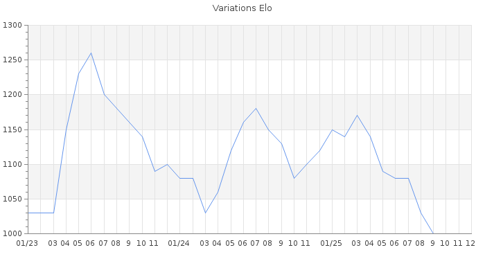 Date d'inscription : 01/04/06. Donateur pour EchecsEmail : Non ( Cliquez ici pour soutenir EchecsEmail. ) Elo non arrondi:1000 ( 454 sur 454 joueurs ) Nombre de victoires :1276 Nombre de nulles :91 Nombre de défaites :2845 Temps de réponse moyen par coup : 1J 22H 29M 55S ( Moyenne sur 84 coups ). Rd ( Un petit rd indique un elo fiable ) : 71 Magic Elo:1163.95 Magic Rd : 80 Elo maximum atteint ( en étant classé ) :1570 Elo maximum atteint cette année :1170 Nombre coups joués : 128014 Inscrit dans l' équipe:No Game No Life Classement coupe : 104 Points coupe : 83.09 Classement Coupe Magic Chess : Inactif Points Coupe Magic Chess : 0 Tournoi échelle : Inactif. Tournois gagnés : 03/02/2025 : Cat 0 : Victoire dans le tournoi n°26310 29/09/2023 : Cat 0 : Victoire dans le tournoi n°25064 07/08/2023 : Cat 0 : Victoire dans le tournoi n°24937 02/05/2022 : Cat 0 : Victoire dans le tournoi n°23803 14/08/2019 : Cat 0 : Victoire dans le tournoi n°19705 10/05/2015 : Cat 0 : Victoire dans le tournoi n°17416 21/03/2013 : Cat 0 : Victoire dans le tournoi n°11871 28/06/2012 : Cat 1 : Victoire dans le tournoi n°10213 22/05/2012 : Cat 0 : Victoire dans le tournoi n°9762 06/09/2011 : Cat 1 : Victoire dans le tournoi n°8791 16/05/2011 : Cat 0 : Victoire dans le tournoi n°8613 07/05/2011 : Cat 0 : Victoire dans le tournoi n°8597 08/04/2011 : Cat 0 : Victoire dans le tournoi n°8510 23/12/2010 : Cat 0 : Victoire dans le tournoi n°7942 27/11/2010 : Cat 0 : Victoire dans le tournoi n°7925 26/09/2010 : Cat 0 : Victoire dans le tournoi n°7566 04/09/2010 : Cat 0 : Victoire dans le tournoi n°7632 01/09/2010 : Cat 0 : Victoire dans le tournoi n°7617 13/03/2010 : Cat 0 : Victoire dans le tournoi n°7004 08/03/2010 : Cat 0 : Victoire dans le tournoi n°6966 08/12/2009 : Cat 0 : Victoire dans le tournoi n°6621 12/10/2009 : Cat 0 : Victoire dans le tournoi n°6197 25/09/2009 : Cat 0 : Victoire dans le tournoi n°6213 17/06/2009 : Cat 0 : Victoire dans le tournoi n°6009 17/06/2009 : Cat 1 : Victoire dans le tournoi n°5674 18/11/2008 : Cat 1 : Victoire dans le tournoi n°5357 12/07/2008 : Cat 1 : Victoire dans le tournoi n°5051 13/03/2008 : Cat 1 : Victoire dans le tournoi n°4602 07/03/2008 : Cat 1 : Victoire dans le tournoi n°4607 10/12/2007 : Cat 1 : Victoire dans le tournoi n°4493 Nombre de tournois gagnés :30
