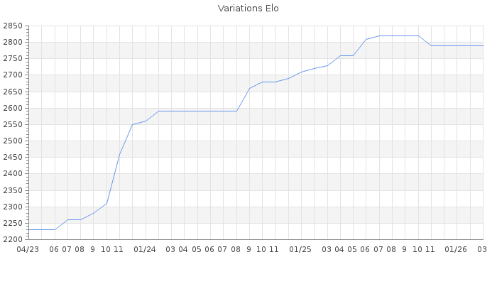 Date d'inscription : 01/11/22. Donateur pour EchecsEmail : Non ( Cliquez ici pour soutenir EchecsEmail. ) Elo non arrondi:2787.3 ( 5 sur 442 joueurs ) Nombre de victoires :47 Nombre de nulles :11 Nombre de défaites :0 Temps de réponse moyen par coup : 0J 6H 50M 45S ( Moyenne sur 108 coups ). Rd ( Un petit rd indique un elo fiable ) : 108 Elo maximum atteint ( en étant classé ) :2820 Elo maximum atteint cette année :2790 Nombre coups joués : 1917 Inscrit dans l' équipe:Fair play Classement coupe : Inactif Points coupe : 0 Classement Coupe Magic Chess : Inactif Points Coupe Magic Chess : 0 Tournoi échelle : Inactif. Tournois gagnés : 13/01/2024 : Cat 6 : Victoire dans le tournoi n°25337 30/11/2023 : Cat 6 : Victoire dans le tournoi n°25304 29/11/2023 : Cat 5 : Victoire dans le tournoi n°25108 12/07/2023 : Cat 5 : Victoire dans le tournoi n°24751 10/03/2023 : Cat 4 : Victoire dans le tournoi n°24556 19/02/2023 : Cat 4 : Victoire dans le tournoi n°24478 09/12/2022 : Cat 2 : Victoire dans le tournoi n°24414 04/12/2022 : Cat 2 : Victoire dans le tournoi n°24384 Nombre de tournois gagnés :8