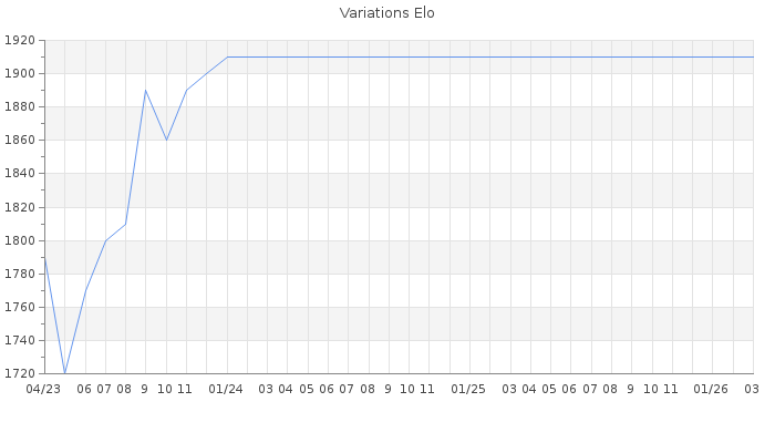 Date d'inscription : 05/02/23. Donateur pour EchecsEmail : Non ( Cliquez ici pour soutenir EchecsEmail. ) Elo non arrondi:1875.1 ( 199 sur 441 joueurs ) Nombre de victoires :102 Nombre de nulles :11 Nombre de défaites :34 Temps de réponse moyen par coup : 0J 4H 45M 15S ( Moyenne sur 0 coups ). Rd ( Un petit rd indique un elo fiable ) : 77 Elo maximum atteint ( en étant classé ) :1910 Elo maximum atteint cette année :0 Nombre coups joués : 5790 Classement coupe : Inactif Points coupe : 0 Classement Coupe Magic Chess : Inactif Points Coupe Magic Chess : 0 Tournoi échelle : Inactif. Tournois gagnés : 02/01/2024 : Cat 3 : Victoire dans le tournoi n°25403 17/09/2023 : Cat 4 : Victoire dans le tournoi n°25193 05/05/2023 : Cat 3 : Victoire dans le tournoi n°24816 22/03/2023 : Cat 1 : Victoire dans le tournoi n°24672 Nombre de tournois gagnés :4