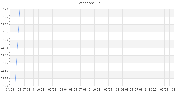 Date d'inscription : 25/12/20. Donateur pour EchecsEmail : Non ( Cliquez ici pour soutenir EchecsEmail. ) Elo non arrondi:1931.3 ( 164 sur 441 joueurs ) Nombre de victoires :83 Nombre de nulles :4 Nombre de défaites :54 Temps de réponse moyen par coup : 1J 8H 43M 38S ( Moyenne sur 0 coups ). Rd ( Un petit rd indique un elo fiable ) : 92 Magic Elo:1309.58 Magic Rd : 295 Elo maximum atteint ( en étant classé ) :2150 Elo maximum atteint cette année :0 Nombre coups joués : 3731 Classement coupe : Inactif Points coupe : 0.28 Classement Coupe Magic Chess : Inactif Points Coupe Magic Chess : 0 Tournoi échelle : Tournois gagnés : 13/03/2021 : Cat 1 : Victoire dans le tournoi n°22401 17/01/2021 : Cat 1 : Victoire dans le tournoi n°22197 Nombre de tournois gagnés :2