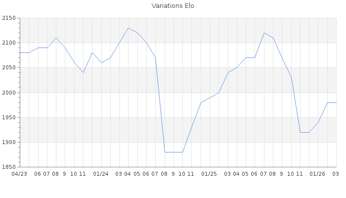Date d'inscription : 31/12/08. Donateur pour EchecsEmail : Non ( Cliquez ici pour soutenir EchecsEmail. ) Elo non arrondi:1980.9 ( 136 sur 442 joueurs ) Nombre de victoires :431 Nombre de nulles :49 Nombre de défaites :85 Temps de réponse moyen par coup : 0J 8H 19M 17S ( Moyenne sur 357 coups ). Rd ( Un petit rd indique un elo fiable ) : 83 Elo maximum atteint ( en étant classé ) :2310 Elo maximum atteint cette année :1980 Nombre coups joués : 21521 Classement coupe : Inactif Points coupe : 0 Classement Coupe Magic Chess : Inactif Points Coupe Magic Chess : 0 Tournoi échelle : Nombre de tournois gagnés :0