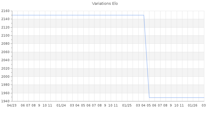 Date d'inscription : 10/09/21. Donateur pour EchecsEmail : Non ( Cliquez ici pour soutenir EchecsEmail. ) Elo non arrondi:1924.7 ( 173 sur 441 joueurs ) Nombre de victoires :16 Nombre de nulles :0 Nombre de défaites :6 Temps de réponse moyen par coup : 0J 21H 32M 13S ( Moyenne sur 0 coups ). Rd ( Un petit rd indique un elo fiable ) : 188 Magic Elo:1700 Magic Rd : 350 Elo maximum atteint ( en étant classé ) :2160 Elo maximum atteint cette année :0 Nombre coups joués : 621 Classement coupe : Inactif Points coupe : 0 Classement Coupe Magic Chess : Inactif Points Coupe Magic Chess : 0 Tournoi échelle : Nombre de tournois gagnés :0