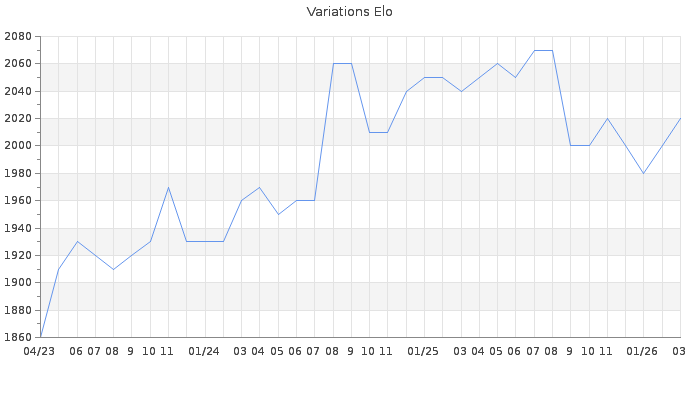 Date d'inscription : Avant le 20/12/05. Donateur pour EchecsEmail : Oui ( Cliquez ici pour soutenir EchecsEmail. ) Elo non arrondi:2015.8 ( 117 sur 441 joueurs ) Nombre de victoires :1659 Nombre de nulles :238 Nombre de défaites :1169 Temps de réponse moyen par coup : 0J 7H 41M 46S ( Moyenne sur 743 coups ). Rd ( Un petit rd indique un elo fiable ) : 69 Magic Elo:1600 Magic Rd : 350 Elo maximum atteint ( en étant classé ) :2100 Elo maximum atteint cette année :2020 Nombre coups joués : 105466 Classement coupe : Inactif, date de la dernière qualification : 06/06/22 Points coupe : 2 Classement Coupe Magic Chess : Inactif Points Coupe Magic Chess : 0 Tournoi échelle : Inactif. Tournois gagnés : 28/04/2024 : Cat 4 : Victoire dans le tournoi n°25730 01/03/2022 : Cat 4 : Victoire dans le tournoi n°23517 27/06/2021 : Cat 4 : Victoire dans le tournoi n°22723 29/01/2021 : Cat 4 : Victoire dans le tournoi n°21840 19/08/2020 : Cat 3 : Victoire dans le tournoi n°21234 16/08/2020 : Cat 4 : Victoire dans le tournoi n°21640 25/06/2020 : Cat 4 : Victoire dans le tournoi n°21374 30/04/2020 : Cat 4 : Victoire dans le tournoi n°20998 07/10/2018 : Cat 4 : Victoire dans le tournoi n°18632 24/07/2018 : Cat 3 : Victoire dans le tournoi n°18353 12/04/2018 : Cat 3 : Victoire dans le tournoi n°17899 23/01/2018 : Cat 3 : Victoire dans le tournoi n°17515 14/11/2017 : Cat 4 : Victoire dans le tournoi n°17231 15/08/2017 : Cat 3 : Victoire dans le tournoi n°16668 16/02/2017 : Cat 4 : Victoire dans le tournoi n°15929 06/11/2016 : Cat 4 : Victoire dans le tournoi n°14754 29/07/2015 : Cat 3 : Victoire dans le tournoi n°17996 05/11/2014 : Cat 4 : Victoire dans le tournoi n°16130 16/08/2014 : Cat 3 : Victoire dans le tournoi n°15781 27/04/2013 : Cat 4 : Victoire dans le tournoi n°11890 10/03/2012 : Cat 4 : Victoire dans le tournoi n°9913 05/01/2010 : Cat 3 : Victoire dans le tournoi n°6504 17/06/2009 : Cat 3 : Victoire dans le tournoi n°5885 31/03/2009 : Cat 3 : Victoire dans le tournoi n°5632 07/02/2009 : Cat 2 : Victoire dans le tournoi n°5348 13/08/2008 : Cat 3 : Victoire dans le tournoi n°5064 05/08/2008 : Cat 2 : Victoire dans le tournoi n°4863 04/09/2007 : Cat 2 : Victoire dans le tournoi n°4249 Nombre de tournois gagnés :28
