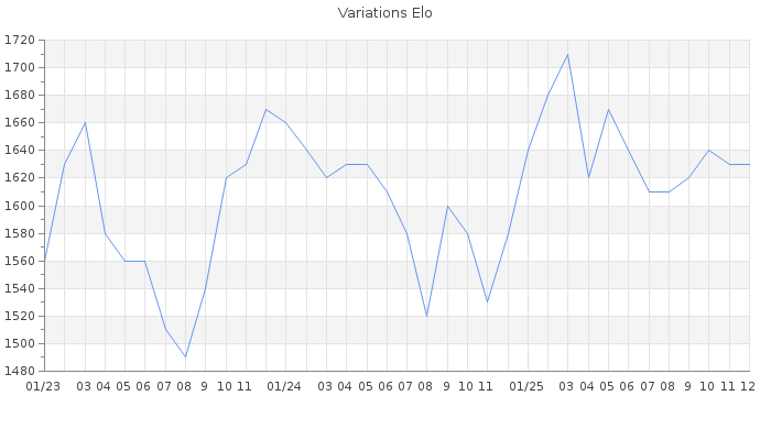 Date d'inscription : 25/08/06. Donateur pour EchecsEmail : Non ( Cliquez ici pour soutenir EchecsEmail. ) Elo non arrondi:1629.2 ( 316 sur 452 joueurs ) Nombre de victoires :909 Nombre de nulles :38 Nombre de défaites :911 Temps de réponse moyen par coup : 0J 16H 49M 36S ( Moyenne sur 564 coups ). Rd ( Un petit rd indique un elo fiable ) : 65 Magic Elo:1700 Magic Rd : 350 Elo maximum atteint ( en étant classé ) :1800 Elo maximum atteint cette année :1720 Nombre coups joués : 58510 Classement coupe : Inactif Points coupe : 0 Classement Coupe Magic Chess : Inactif Points Coupe Magic Chess : 0 Tournoi échelle : Nombre de tournois gagnés :0