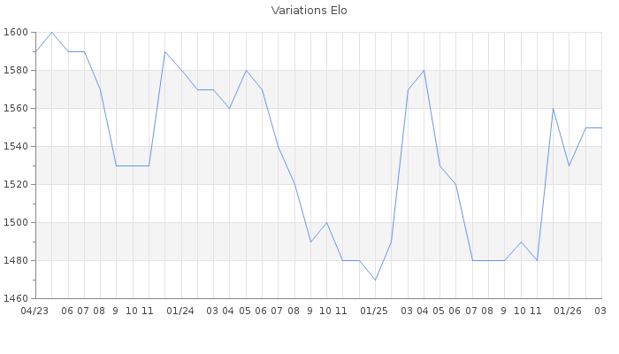Date d'inscription : Avant le 20/12/05. Donateur pour EchecsEmail : Non ( Cliquez ici pour soutenir EchecsEmail. ) Elo non arrondi:1553.7 ( 334 sur 442 joueurs ) Nombre de victoires :1492 Nombre de nulles :190 Nombre de défaites :1721 Temps de réponse moyen par coup : 0J 3H 49M 56S ( Moyenne sur 1009 coups ). Rd ( Un petit rd indique un elo fiable ) : 56 Magic Elo:1700 Magic Rd : 350 Elo maximum atteint ( en étant classé ) :1650 Elo maximum atteint cette année :1570 Nombre coups joués : 92404 Classement coupe : Inactif Points coupe : 0 Classement Coupe Magic Chess : Inactif Points Coupe Magic Chess : 0 Tournoi échelle : Inactif. Tournois gagnés : 23/12/2006 : Cat 0 : Victoire dans le tournoi n°3384 02/08/2006 : Cat 0 : Victoire dans le tournoi n°3061 02/12/2005 : Cat 0 : Victoire dans le tournoi n°2084 23/11/2005 : Cat 0 : Victoire dans le tournoi n°2175 26/01/2005 : Cat 0 : Victoire dans le tournoi n°1194 23/07/2004 : Cat 0 : Victoire dans le tournoi n°858 Nombre de tournois gagnés :6