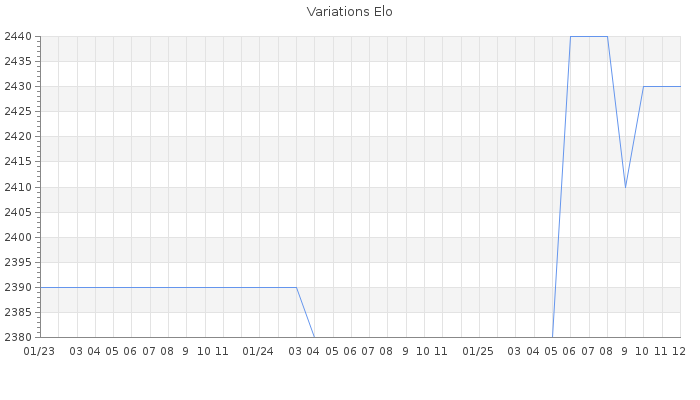 Date d'inscription : 14/06/16. Donateur pour EchecsEmail : Non ( Cliquez ici pour soutenir EchecsEmail. ) Elo non arrondi:2428.1 ( 27 sur 449 joueurs ) Nombre de victoires :51 Nombre de nulles :17 Nombre de défaites :2 Temps de réponse moyen par coup : 0J 17H 28M 50S ( Moyenne sur 45 coups ). Rd ( Un petit rd indique un elo fiable ) : 119 Magic Elo:1600 Magic Rd : 350 Elo maximum atteint ( en étant classé ) :2470 Elo maximum atteint cette année :2470 Nombre coups joués : 2240 Classement coupe : Inactif Points coupe : 0 Classement Coupe Magic Chess : Inactif Points Coupe Magic Chess : 0 Tournoi échelle : Inactif. Tournois gagnés : 07/01/2023 : Cat 6 : Victoire dans le tournoi n°24250 26/08/2022 : Cat 5 : Victoire dans le tournoi n°24141 08/09/2019 : Cat 4 : Victoire dans le tournoi n°19115 10/04/2019 : Cat 4 : Victoire dans le tournoi n°19156 19/12/2018 : Cat 4 : Victoire dans le tournoi n°19022 Nombre de tournois gagnés :5