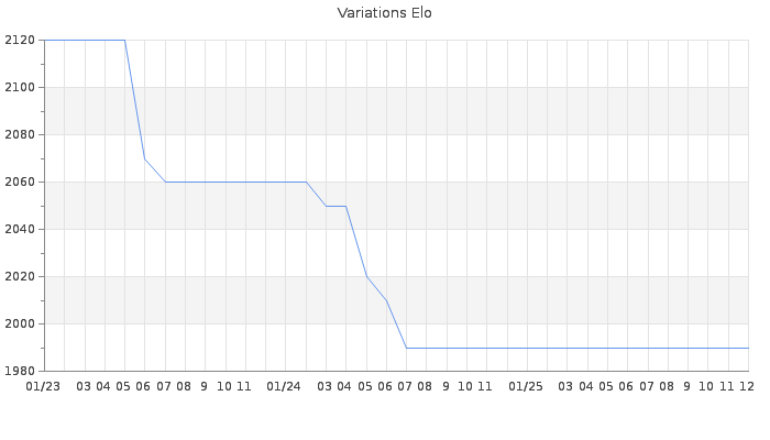 Date d'inscription : 29/01/12. Donateur pour EchecsEmail : Non ( Cliquez ici pour soutenir EchecsEmail. ) Elo non arrondi:1968.6 ( 134 sur 456 joueurs ) Nombre de victoires :278 Nombre de nulles :53 Nombre de défaites :131 Temps de réponse moyen par coup : 1J 8H 4M 42S ( Moyenne sur 22 coups ). Rd ( Un petit rd indique un elo fiable ) : 112 Magic Elo:1427.69 Magic Rd : 251 Elo maximum atteint ( en étant classé ) :2350 Elo maximum atteint cette année :0 Nombre coups joués : 13107 Inscrit dans l' équipe:LechiquierDesHurlus Classement coupe : Inactif Points coupe : 2.96 Classement Coupe Magic Chess : Inactif Points Coupe Magic Chess : 0 Tournoi échelle : Inactif. Nombre de tournois gagnés :0
