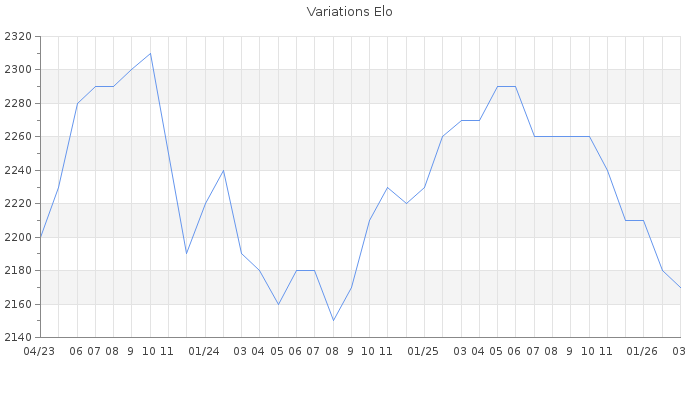 Date d'inscription : Avant le 20/12/05. Donateur pour EchecsEmail : Non ( Cliquez ici pour soutenir EchecsEmail. ) Elo non arrondi:2173.1 ( 70 sur 440 joueurs ) Nombre de victoires :883 Nombre de nulles :278 Nombre de défaites :520 Temps de réponse moyen par coup : 0J 5H 13M 57S ( Moyenne sur 710 coups ). Rd ( Un petit rd indique un elo fiable ) : 66 Magic Elo:1859.62 Magic Rd : 201 Elo maximum atteint ( en étant classé ) :2330 Elo maximum atteint cette année :2220 Nombre coups joués : 58421 Classement coupe : 18 Points coupe : 5703.81 Classement Coupe Magic Chess : Inactif Points Coupe Magic Chess : 0 Tournoi échelle : Inactif. Tournois gagnés : 27/07/2007 : Cat 3 : Victoire dans le tournoi n°4189 07/01/2006 : Cat 3 : Victoire dans le tournoi n°2001 03/10/2005 : Cat 3 : Victoire dans le tournoi n°1713 Nombre de tournois gagnés :3