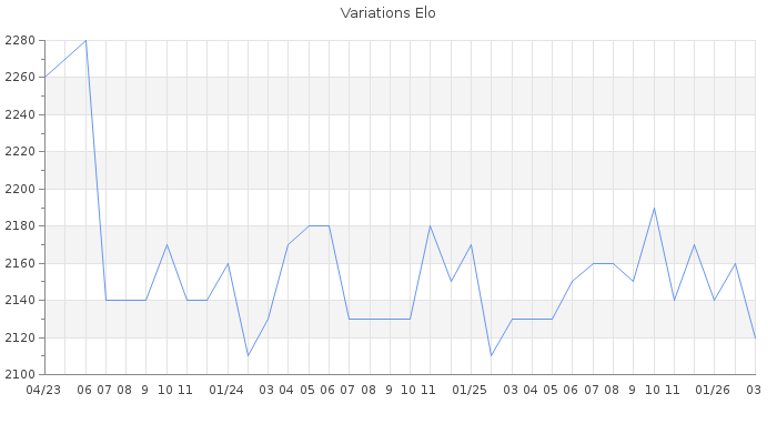 Date d'inscription : 24/04/17. Donateur pour EchecsEmail : Non ( Cliquez ici pour soutenir EchecsEmail. ) Elo non arrondi:2122.8 ( 84 sur 441 joueurs ) Nombre de victoires :131 Nombre de nulles :11 Nombre de défaites :28 Temps de réponse moyen par coup : 0J 16H 42M 55S ( Moyenne sur 150 coups ). Rd ( Un petit rd indique un elo fiable ) : 103 Magic Elo:1700 Magic Rd : 350 Elo maximum atteint ( en étant classé ) :2360 Elo maximum atteint cette année :2170 Nombre coups joués : 6664 Classement coupe : Inactif Points coupe : 0 Classement Coupe Magic Chess : Inactif Points Coupe Magic Chess : 0 Tournoi échelle : Nombre de tournois gagnés :0