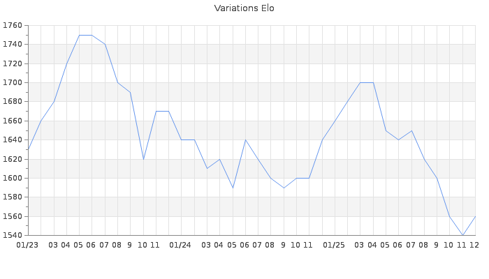 Date d'inscription : 26/12/11. Donateur pour EchecsEmail : Non ( Cliquez ici pour soutenir EchecsEmail. ) Elo non arrondi:1558.6 ( 350 sur 458 joueurs ) Nombre de victoires :433 Nombre de nulles :25 Nombre de défaites :524 Temps de réponse moyen par coup : 0J 18H 5M 3S ( Moyenne sur 404 coups ). Rd ( Un petit rd indique un elo fiable ) : 73 Magic Elo:1600 Magic Rd : 350 Elo maximum atteint ( en étant classé ) :1810 Elo maximum atteint cette année :1720 Nombre coups joués : 34742 Classement coupe : Inactif Points coupe : 0 Classement Coupe Magic Chess : Inactif Points Coupe Magic Chess : 0 Tournoi échelle : Inactif. Tournois gagnés : 24/03/2025 : Cat 3 : Victoire dans le tournoi n°26538 07/03/2023 : Cat 2 : Victoire dans le tournoi n°24546 05/01/2023 : Cat 2 : Victoire dans le tournoi n°24500 24/01/2021 : Cat 2 : Victoire dans le tournoi n°22155 16/10/2020 : Cat 2 : Victoire dans le tournoi n°21731 11/08/2020 : Cat 2 : Victoire dans le tournoi n°21524 07/07/2020 : Cat 2 : Victoire dans le tournoi n°21437 23/06/2020 : Cat 2 : Victoire dans le tournoi n°21251 09/12/2018 : Cat 3 : Victoire dans le tournoi n°18992 Nombre de tournois gagnés :9