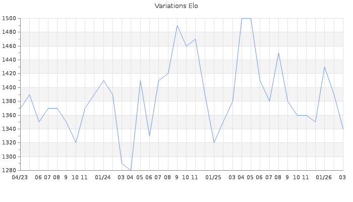 Date d'inscription : Avant le 20/12/05. Donateur pour EchecsEmail : Non ( Cliquez ici pour soutenir EchecsEmail. ) Elo non arrondi:1338.2 ( 401 sur 442 joueurs ) Nombre de victoires :9929 Nombre de nulles :447 Nombre de défaites :16472 Temps de réponse moyen par coup : 0J 5H 0M 34S ( Moyenne sur 9042 coups ). Rd ( Un petit rd indique un elo fiable ) : 50 Magic Elo:1362.94 Magic Rd : 80 Elo maximum atteint ( en étant classé ) :1730 Elo maximum atteint cette année :1460 Nombre coups joués : 896058 Inscrit dans l' équipe:fouschess Classement coupe : 53 Points coupe : 448.27 Classement Coupe Magic Chess : Inactif Points Coupe Magic Chess : 0 Tournoi échelle : Inactif. Tournois gagnés : 04/03/2026 : Cat 2 : Victoire dans le tournoi n°27459 04/03/2026 : Cat 1 : Victoire dans le tournoi n°27442 21/02/2026 : Cat 1 : Victoire dans le tournoi n°27434 06/02/2026 : Cat 1 : Victoire dans le tournoi n°27328 29/11/2025 : Cat 2 : Victoire dans le tournoi n°27025 10/11/2025 : Cat 1 : Victoire dans le tournoi n°27096 07/11/2025 : Cat 2 : Victoire dans le tournoi n°27177 01/10/2025 : Cat 1 : Victoire dans le tournoi n°26919 16/09/2025 : Cat 1 : Victoire dans le tournoi n°26996 22/07/2025 : Cat 1 : Victoire dans le tournoi n°26862 09/07/2025 : Cat 1 : Victoire dans le tournoi n°26713 27/06/2025 : Cat 1 : Victoire dans le tournoi n°26764 19/06/2025 : Cat 2 : Victoire dans le tournoi n°26784 07/06/2025 : Cat 1 : Victoire dans le tournoi n°26742 01/05/2025 : Cat 1 : Victoire dans le tournoi n°26675 28/04/2025 : Cat 1 : Victoire dans le tournoi n°26637 17/04/2025 : Cat 1 : Victoire dans le tournoi n°26638 26/03/2025 : Cat 1 : Victoire dans le tournoi n°26590 17/02/2025 : Cat 1 : Victoire dans le tournoi n°26444 30/12/2024 : Cat 2 : Victoire dans le tournoi n°26302 22/10/2024 : Cat 1 : Victoire dans le tournoi n°26090 16/09/2024 : Cat 1 : Victoire dans le tournoi n°26039 10/09/2024 : Cat 1 : Victoire dans le tournoi n°26030 23/08/2024 : Cat 1 : Victoire dans le tournoi n°25993 27/07/2024 : Cat 1 : Victoire dans le tournoi n°25912 12/07/2024 : Cat 1 : Victoire dans le tournoi n°25887 19/06/2024 : Cat 1 : Victoire dans le tournoi n°25838 11/05/2024 : Cat 1 : Victoire dans le tournoi n°25799 04/03/2024 : Cat 1 : Victoire dans le tournoi n°25500 28/02/2024 : Cat 1 : Victoire dans le tournoi n°25409 13/02/2024 : Cat 1 : Victoire dans le tournoi n°25578 06/02/2024 : Cat 1 : Victoire dans le tournoi n°25536 27/01/2024 : Cat 2 : Victoire dans le tournoi n°25513 14/01/2024 : Cat 2 : Victoire dans le tournoi n°25452 26/12/2023 : Cat 1 : Victoire dans le tournoi n°25446 22/12/2023 : Cat 0 : Victoire dans le tournoi n°25285 02/10/2023 : Cat 2 : Victoire dans le tournoi n°25236 05/08/2023 : Cat 1 : Victoire dans le tournoi n°25077 05/07/2023 : Cat 2 : Victoire dans le tournoi n°25031 15/06/2023 : Cat 1 : Victoire dans le tournoi n°24980 18/04/2023 : Cat 1 : Victoire dans le tournoi n°24761 16/04/2023 : Cat 1 : Victoire dans le tournoi n°24786 27/12/2022 : Cat 2 : Victoire dans le tournoi n°24407 02/12/2022 : Cat 1 : Victoire dans le tournoi n°24417 29/11/2022 : Cat 1 : Victoire dans le tournoi n°24291 11/11/2022 : Cat 1 : Victoire dans le tournoi n°24314 02/08/2022 : Cat 2 : Victoire dans le tournoi n°24111 18/07/2022 : Cat 1 : Victoire dans le tournoi n°23981 04/07/2022 : Cat 1 : Victoire dans le tournoi n°23793 15/06/2022 : Cat 1 : Victoire dans le tournoi n°23931 13/06/2022 : Cat 2 : Victoire dans le tournoi n°23948 02/06/2022 : Cat 2 : Victoire dans le tournoi n°23910 30/04/2022 : Cat 1 : Victoire dans le tournoi n°23819 31/01/2022 : Cat 1 : Victoire dans le tournoi n°23564 24/11/2021 : Cat 1 : Victoire dans le tournoi n°23366 18/10/2021 : Cat 2 : Victoire dans le tournoi n°23238 15/10/2021 : Cat 1 : Victoire dans le tournoi n°23208 14/10/2021 : Cat 2 : Victoire dans le tournoi n°23185 25/09/2021 : Cat 2 : Victoire dans le tournoi n°22933 20/09/2021 : Cat 1 : Victoire dans le tournoi n°23169 19/09/2021 : Cat 1 : Victoire dans le tournoi n°23121 16/09/2021 : Cat 1 : Victoire dans le tournoi n°23064 15/09/2021 : Cat 1 : Victoire dans le tournoi n°23129 17/08/2021 : Cat 1 : Victoire dans le tournoi n°22555 07/08/2021 : Cat 2 : Victoire dans le tournoi n°22864 01/08/2021 : Cat 1 : Victoire dans le tournoi n°22985 30/07/2021 : Cat 2 : Victoire dans le tournoi n°22770 28/07/2021 : Cat 2 : Victoire dans le tournoi n°22967 27/07/2021 : Cat 2 : Victoire dans le tournoi n°22843 24/07/2021 : Cat 2 : Victoire dans le tournoi n°22937 19/07/2021 : Cat 2 : Victoire dans le tournoi n°22892 03/07/2021 : Cat 2 : Victoire dans le tournoi n°22597 18/05/2021 : Cat 2 : Victoire dans le tournoi n°22773 04/05/2021 : Cat 2 : Victoire dans le tournoi n°22681 13/04/2021 : Cat 1 : Victoire dans le tournoi n°22546 29/03/2021 : Cat 2 : Victoire dans le tournoi n°22524 05/02/2021 : Cat 1 : Victoire dans le tournoi n°21834 16/12/2020 : Cat 2 : Victoire dans le tournoi n°22078 14/12/2020 : Cat 1 : Victoire dans le tournoi n°21898 11/12/2020 : Cat 1 : Victoire dans le tournoi n°22020 03/12/2020 : Cat 2 : Victoire dans le tournoi n°22039 26/11/2020 : Cat 1 : Victoire dans le tournoi n°21878 26/11/2020 : Cat 2 : Victoire dans le tournoi n°21849 06/10/2020 : Cat 1 : Victoire dans le tournoi n°21846 22/09/2020 : Cat 2 : Victoire dans le tournoi n°21701 12/09/2020 : Cat 1 : Victoire dans le tournoi n°21554 05/09/2020 : Cat 2 : Victoire dans le tournoi n°21700 29/08/2020 : Cat 1 : Victoire dans le tournoi n°21569 21/08/2020 : Cat 2 : Victoire dans le tournoi n°21535 15/08/2020 : Cat 2 : Victoire dans le tournoi n°21601 13/08/2020 : Cat 1 : Victoire dans le tournoi n°21606 22/07/2020 : Cat 1 : Victoire dans le tournoi n°21506 19/07/2020 : Cat 2 : Victoire dans le tournoi n°21487 01/07/2020 : Cat 2 : Victoire dans le tournoi n°21425 22/06/2020 : Cat 1 : Victoire dans le tournoi n°21330 21/06/2020 : Cat 2 : Victoire dans le tournoi n°21404 09/06/2020 : Cat 2 :
