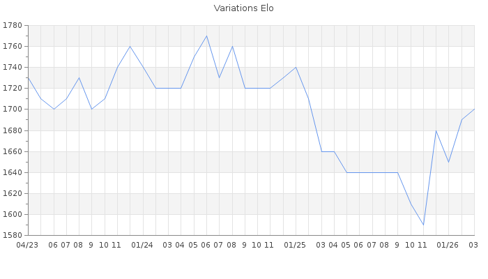 Date d'inscription : 24/08/08. Donateur pour EchecsEmail : Non ( Cliquez ici pour soutenir EchecsEmail. ) Elo non arrondi:1704.2 ( 263 sur 442 joueurs ) Nombre de victoires :1602 Nombre de nulles :228 Nombre de défaites :2058 Temps de réponse moyen par coup : 0J 4H 53M 33S ( Moyenne sur 849 coups ). Rd ( Un petit rd indique un elo fiable ) : 68 Magic Elo:1600 Magic Rd : 350 Elo maximum atteint ( en étant classé ) :2090 Elo maximum atteint cette année :1710 Nombre coups joués : 147553 Classement coupe : Inactif Points coupe : 0 Classement Coupe Magic Chess : Inactif Points Coupe Magic Chess : 0 Tournoi échelle : Inactif. Nombre de tournois gagnés :0