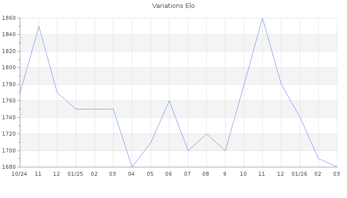 Date d'inscription : 02/10/24. Donateur pour EchecsEmail : Non ( Cliquez ici pour soutenir EchecsEmail. ) Elo non arrondi:1676.5 ( 273 sur 442 joueurs ) Nombre de victoires :333 Nombre de nulles :72 Nombre de défaites :286 Temps de réponse moyen par coup : 0J 11H 7M 48S ( Moyenne sur 2343 coups ). Rd ( Un petit rd indique un elo fiable ) : 58 Magic Elo:1700 Magic Rd : 350 Elo maximum atteint ( en étant classé ) :1930 Elo maximum atteint cette année :1800 Nombre coups joués : 26950 Inscrit dans l' équipe:O fou d hello Classement coupe : Inactif Points coupe : 0 Classement Coupe Magic Chess : Inactif Points Coupe Magic Chess : 0 Tournoi échelle : Tournois gagnés : 25/09/2025 : Cat 3 : Victoire dans le tournoi n°27014 16/07/2025 : Cat 3 : Victoire dans le tournoi n°26835 08/05/2025 : Cat 3 : Victoire dans le tournoi n°26504 19/12/2024 : Cat 2 : Victoire dans le tournoi n°26113 05/12/2024 : Cat 3 : Victoire dans le tournoi n°26265 03/12/2024 : Cat 3 : Victoire dans le tournoi n°26184 26/10/2024 : Cat 1 : Victoire dans le tournoi n°26137 17/10/2024 : Cat 2 : Victoire dans le tournoi n°26136 Nombre de tournois gagnés :8