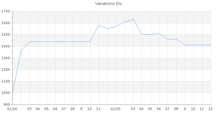 Date d'inscription : 23/01/24. Donateur pour EchecsEmail : Non ( Cliquez ici pour soutenir EchecsEmail. ) Elo non arrondi:1409.8 ( 410 sur 452 joueurs ) Nombre de victoires :10 Nombre de nulles :3 Nombre de défaites :40 Temps de réponse moyen par coup : 1J 12H 33M 6S ( Moyenne sur 16 coups ). Rd ( Un petit rd indique un elo fiable ) : 90 Elo maximum atteint ( en étant classé ) :1650 Elo maximum atteint cette année :1650 Nombre coups joués : 943 Inscrit dans l' équipe:Royal Kids Classement coupe : Inactif Points coupe : 0 Classement Coupe Magic Chess : Inactif Points Coupe Magic Chess : 0 Tournoi échelle : Nombre de tournois gagnés :0